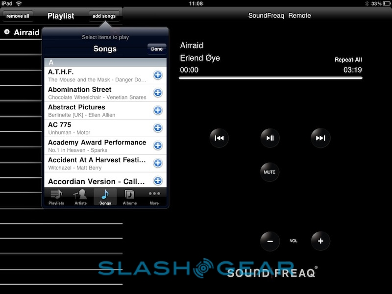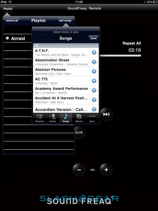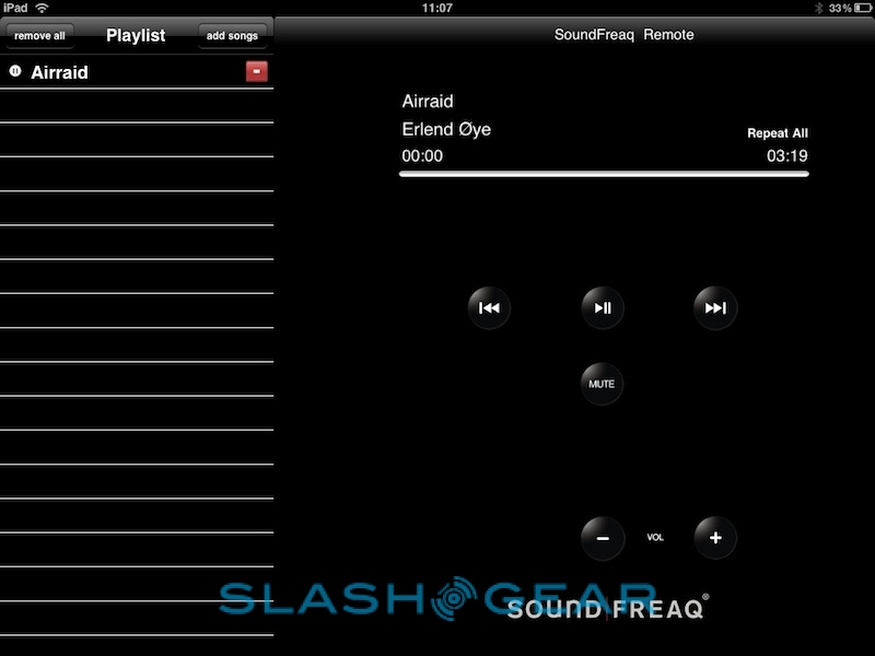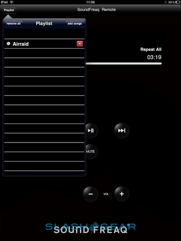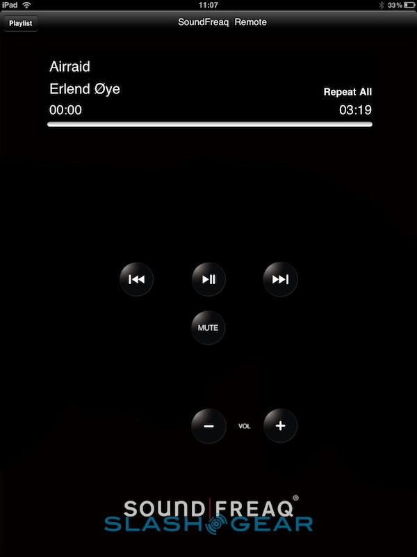 The iPad's standard music app will happily stream to the SFQ-01A wirelessly, though while the play/pause button on the dock's control panel worked as expected, the track-skip buttons did not. However, there's also the special SoundFreaq app in the App Store; this is a basic media player with full interaction between the SFQ-01A buttons and the app UI. You can queue up tracks from your music catalog into custom playlists, though the UI itself feels a little cramped: the navigation box shows just 7 tracks at a time, despite the amount of screen the iPad has to offer. Still, you can view tracks by artist, song and album, among other things, as well as import playlists from elsewhere.