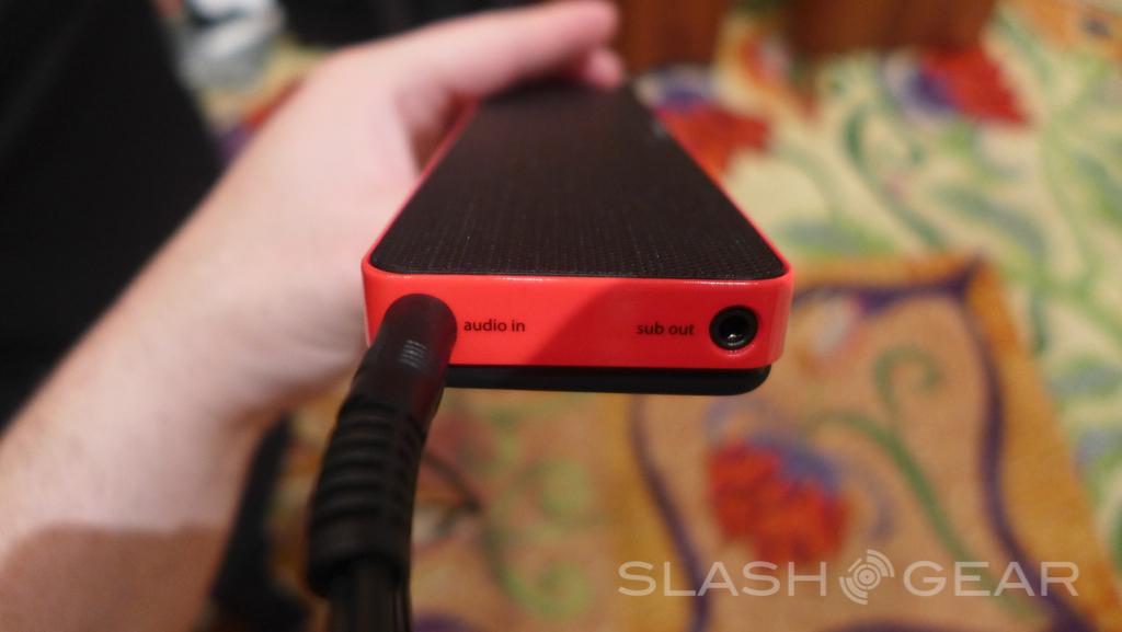 As you can see from our images below, the device is impressively sleek and we can confirm it's rather light and ultra portable. Being able to lightly toss it nearly anywhere your smartphone or iPad goes without wasting much more space makes it quite versatile compared to some of their competition. The front face has the power button and led, along with a volume up/down dedicated button for ease of use. Around to the side is a 3.5mm audio out if you opt not to use Bluetooth, as well as a sub out feature if you really want to push out some bass.