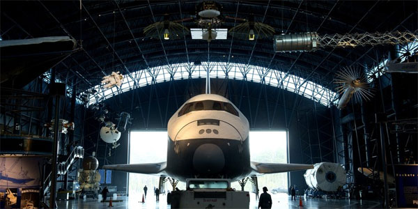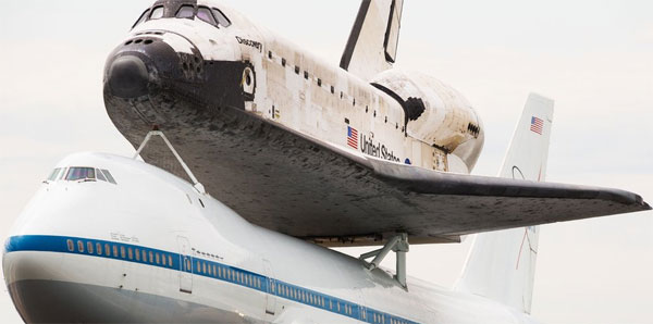 The brown marks and discolored heat resistant tiles on the belly of the spacecraft are the result of incredible temperatures that the space shuttle was subject to on reentry to the Earth's atmosphere. During reentry, the exterior of the ship could reach as high as 1650°C. It was damage to those black heat resistant tiles that is believed to have led to the sad death of the astronauts aboard the Columbia in 2003. In one of the photos, the Discovery is practically touching nose to nose with a test shuttle Enterprise that never went into space.