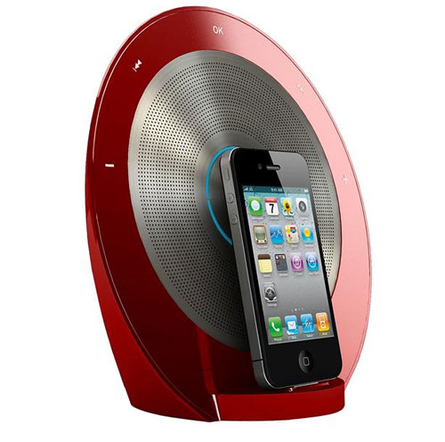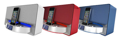 The KX-100 is a dock offered in silver, red, and blue with LED lighting and high quality audio. The device has DSP processing and features an AM/FM alarm clock and 20 pre-set stations. The clock on the dock automatically syncs with the time on your iPhone and the dock is powered by a wall outlet normally with a battery backup with AAs for portable use.