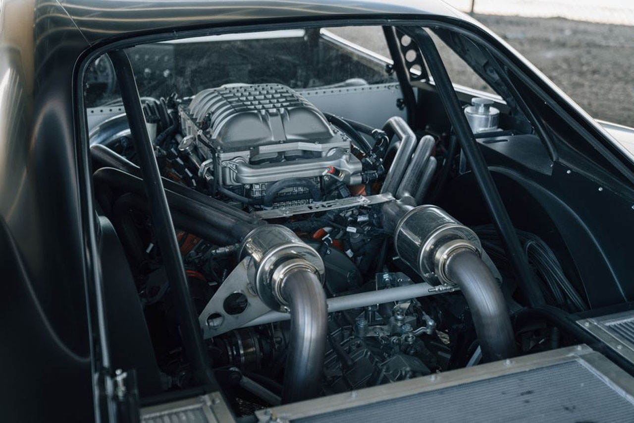 On the outside, the heavily customized ride looks mostly like a 1968 Charger. However, if you look at the hood, you won't find the big V-8 engine you might expect because this car is mid-engine. The engine sitting behind the seats is a supercharged Dodge Hellcat engine. As heavily customized as the car is, that Hellcat engine is box stock.