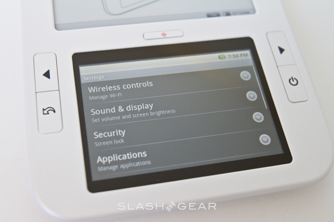 Unfortunately, the sync button functionality isn't native to Android, and requires that apps be specially coded to play nicely with the dual-displays. While the preloaded titles are obviously compatible, apps you load via Android Market workarounds are unlikely to be. There can also be some resolution hiccups, since there's no way to, say, highlight just the text you want to transfer from LCD to E Ink, and you're only working with an 800 x 600 panel. Still, it's a brilliant way to consume long-form articles online: we found sending ourself an email with a list of links was far easier than clipping pieces and then trying to sync them to a Kindle. One thing worth remembering is that the upper display isn't fixed: it periodically updates as you browse on the lower display, so if you flip up an article to read you'll need to do that straight away unless you want it to navigate away.