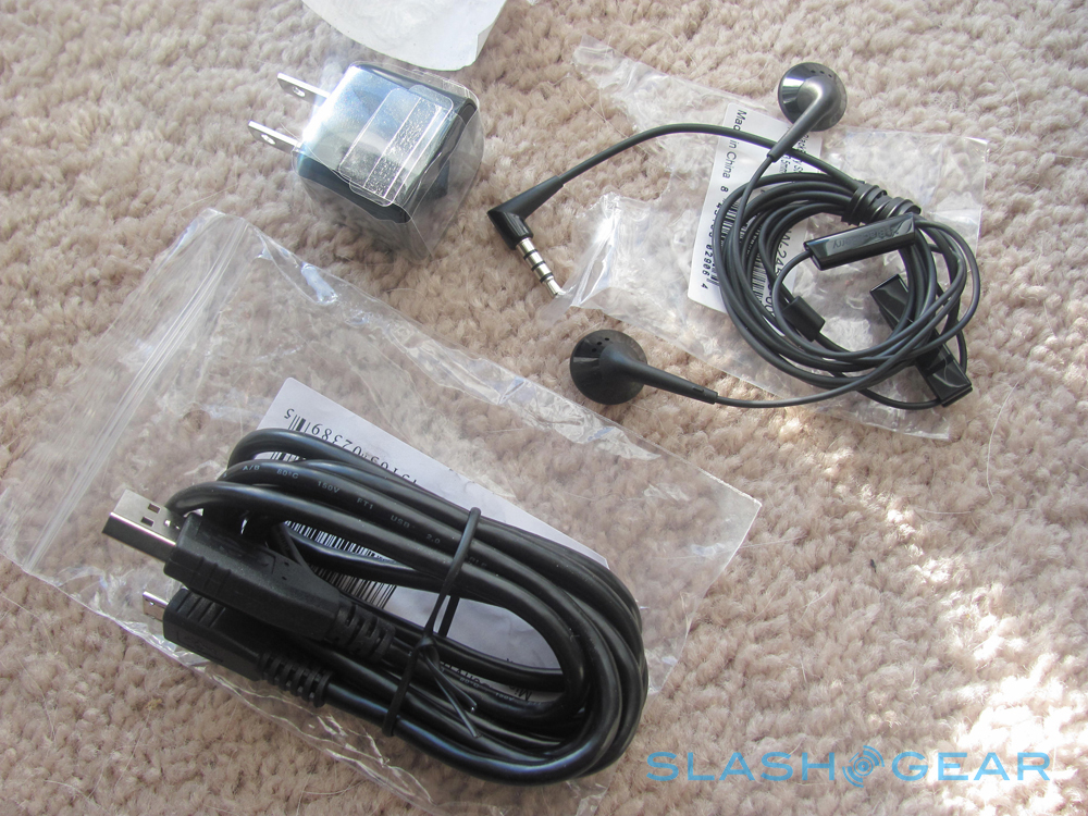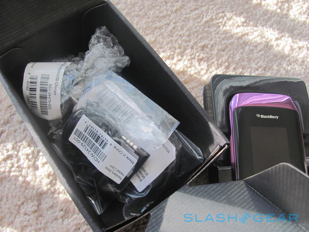 Once inside the box, you'll see the 9670 right on top held in place by a plastic-formed surround piece. This piece comes out easily, and the phone pops out easily with it (secure, yet simple to access.) Behind that, there's a pull-out panel with a generous 1.5m BlackBerry USB Cable (I have a brain-fart in the video when I see it, but that's what it is, a Fixed Blade Micro USB charger (which of course is the US version, as that's where I am, and it comes in a separate wrap from the cable itself,) and a lovely BlackBerry stereo headset.