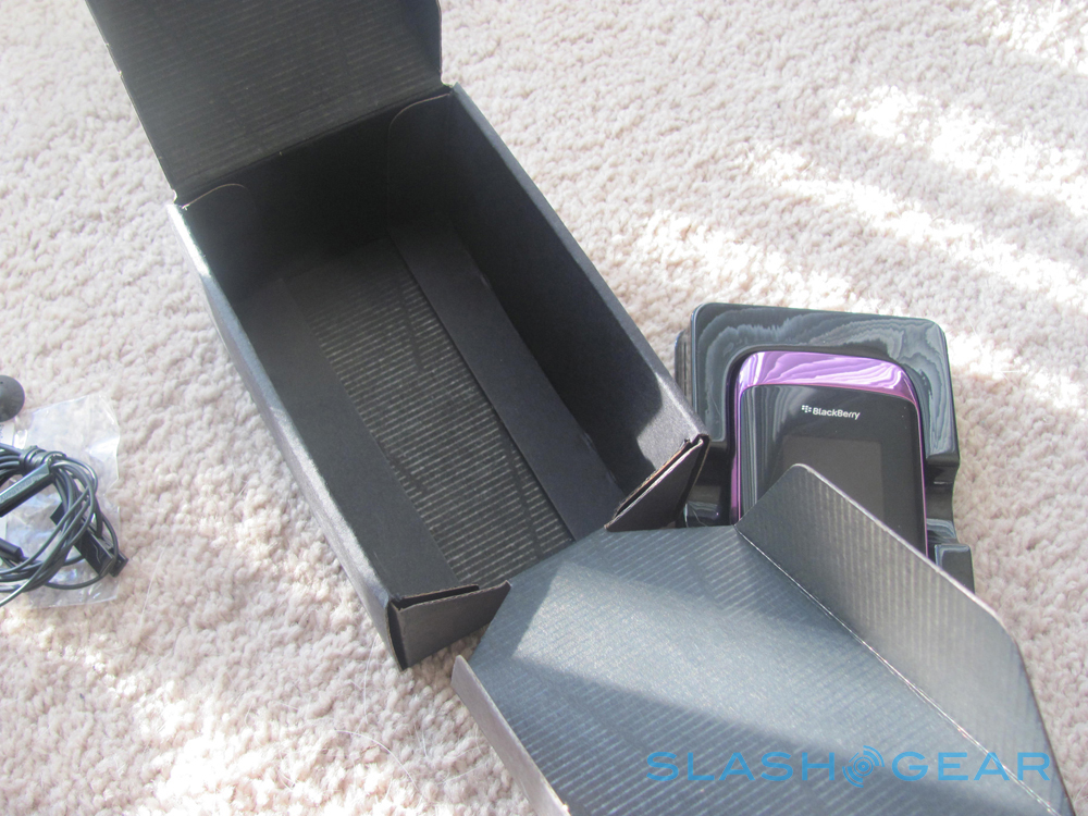 Hooray for mail! Today what's arrived is the very shiny clamshell BlackBerry Style 9670, available in steel grey or royal purple. Of course, since I'm in Minneapolis, home of The Purple One himself, Prince, you know that the royal purple is the one that arrived on my doorstep. Below see the unboxing of the fabulously re-usable box with lovely shine-tastic phone and extras inside.