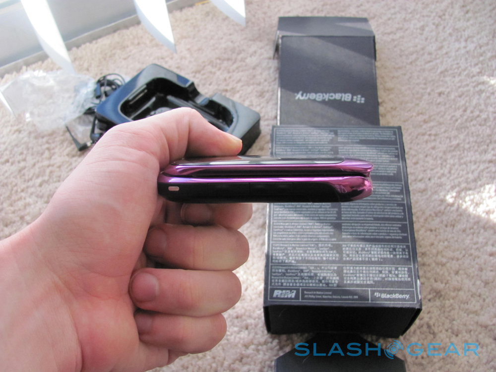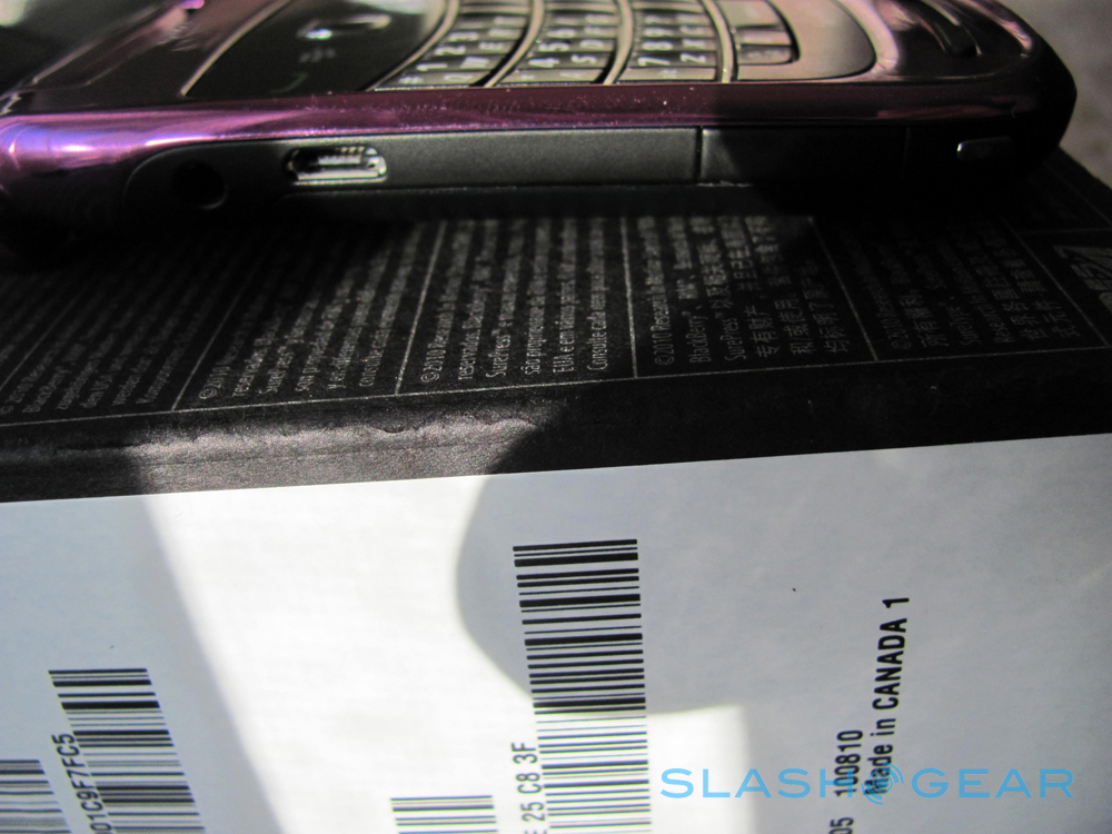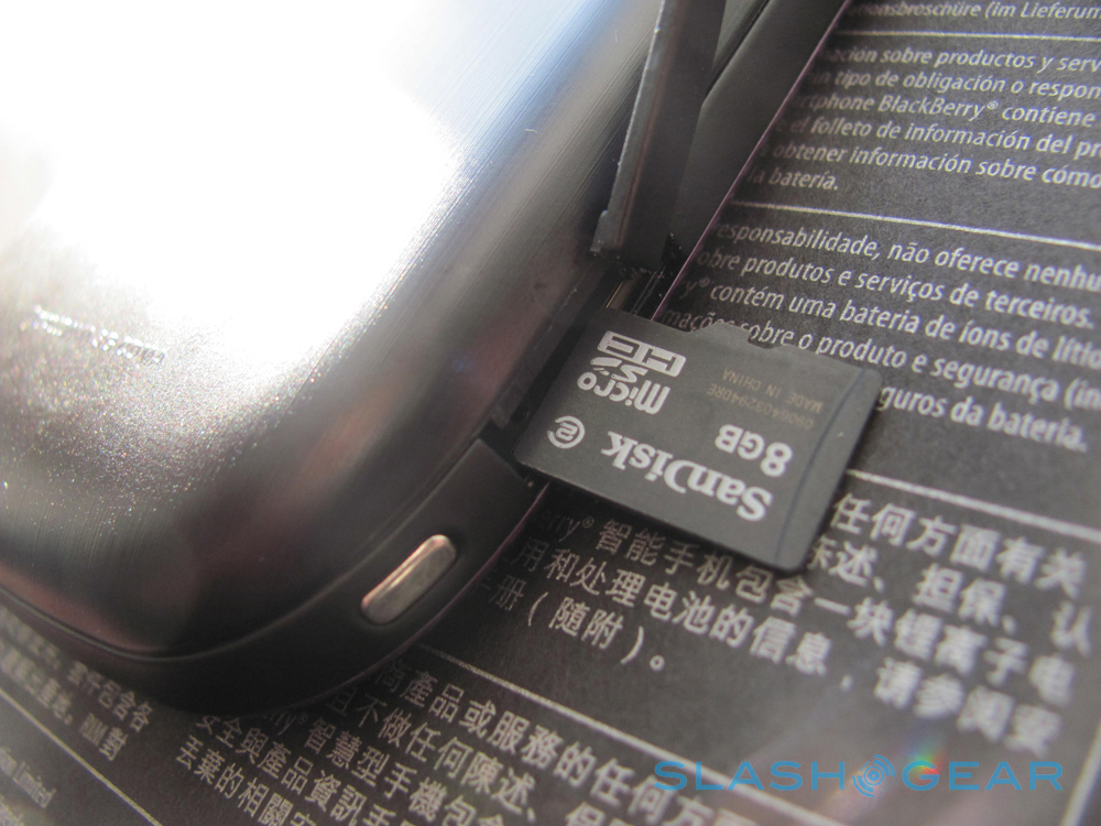Also along the left side of the phone is an almost-hidden compartment where you can access your microSD card. This, I must say, is a vast improvement over having to pop your battery out every time you want at it. Well played, BB designers. Full review coming soon!