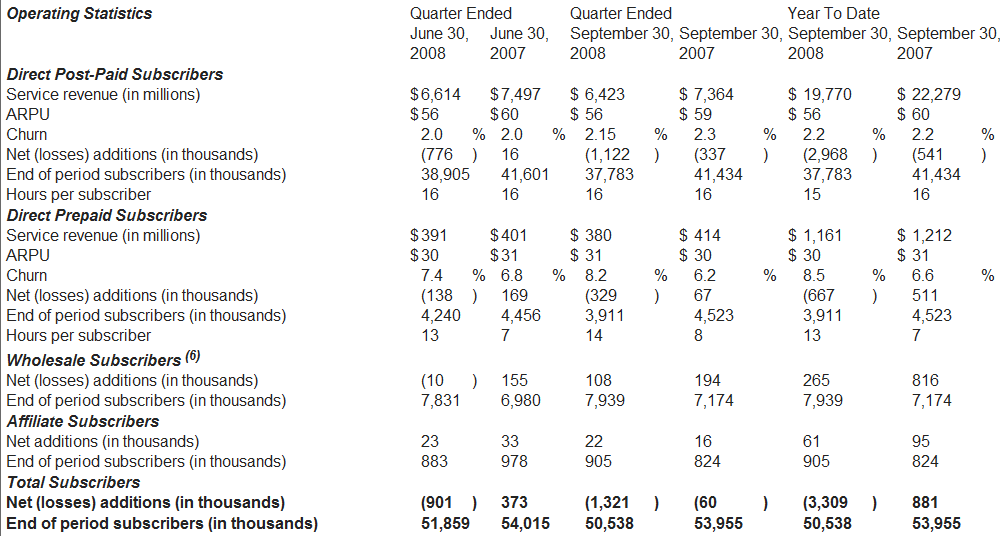 While post-pay ARPU stayed stable from Q1 and Q2, at $56, that's still a reduction of 6-percent over Q3 2007. Pre-pay ARPU rose by a dollar over the same period, to $31. The carrier had a total of 50.5m customers at the end of the quarter, down from 54m at the end of Q3 2007.