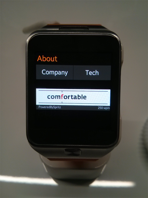 Considering the limitation of small displays on wearables – which has led companies like Google to remind Glass wearers that the headset is intended for impromptu notifications, not for consuming whole novels – Spritz certainly seems like an interesting alternative to lots of page scrolling and panning. In our own quick tests using the company's demo, we were able to comfortably get to 500wpm within minutes.