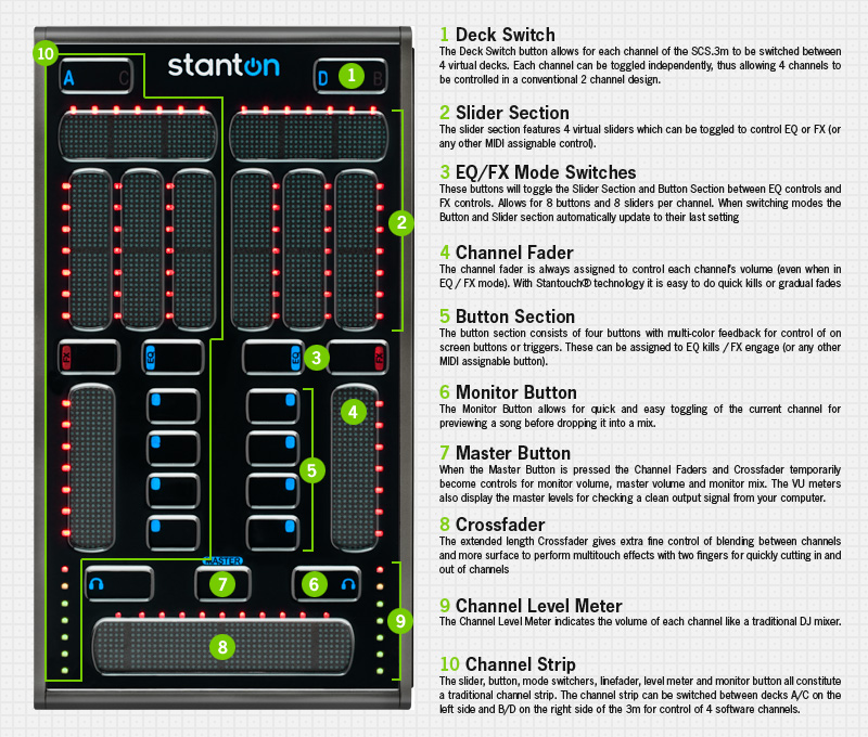 The SCS.3m incorporates all of the functions of a two channel DJ mixer, plus a host of new performance features made possible by Stanton's unique touch sensitive control surface. The touch sensitive sliders can be used to tweak EQs, allowing DJs to bring in different elements of a song during a mix, or instantly switch the sliders to control FX parameters within Traktor LE. The wide, touch-sensitive crossfader allows for seamless slow blends between decks, but is also able to detect multiple finger presses, allowing for quick transform effects all in one control surface. The multicolor buttons can easily perform transport controls for starting and stopping playback, setting loops, doing EQ kills, or engaging effects without requiring a separate trigger controller. All of the visual indicators stay 100% in sync with applications supporting MIDI feedback, allowing for clear indication of the software settings and positions in low light situations. Additionally, the unique surface provides a new level of durability, since there are no moving parts to wear or break.