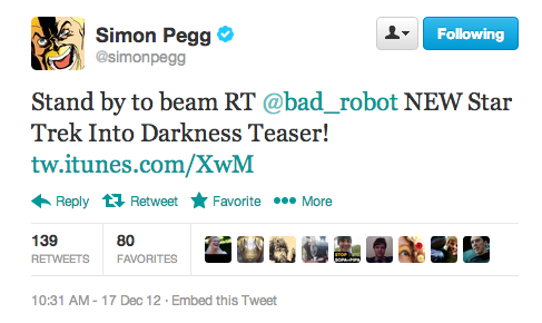Simon Pegg has once again tipped the world off on the next-generation Star Trek Into Darkness trailer that also came along with viewings of The Hobbit over the past two days. This is the first time the trailer has been available online in it full form and in HD greatness, no less. This trailer comes in the form of a bit of dialogue from our friendly villain for the film as he tells Jim Kirk how terrible his life is about to be: fun stuff!