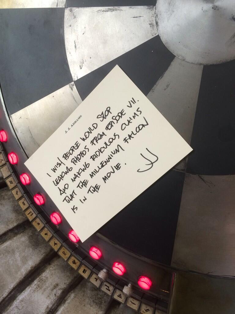Speaking in a note about leaks of images from earlier this week, Abrams also comments specifically about the Falcon. Without the setting, this comment would probably be interpreted as an extra annoyance.