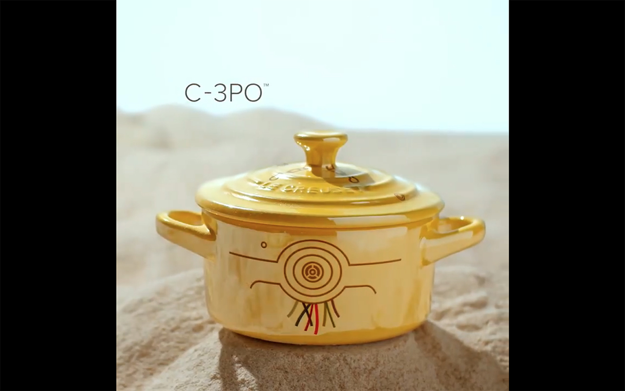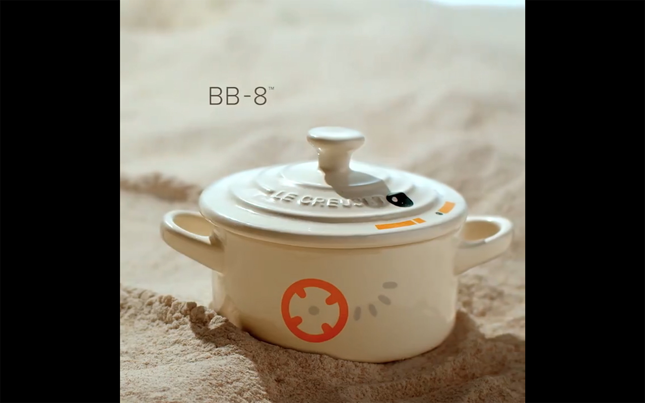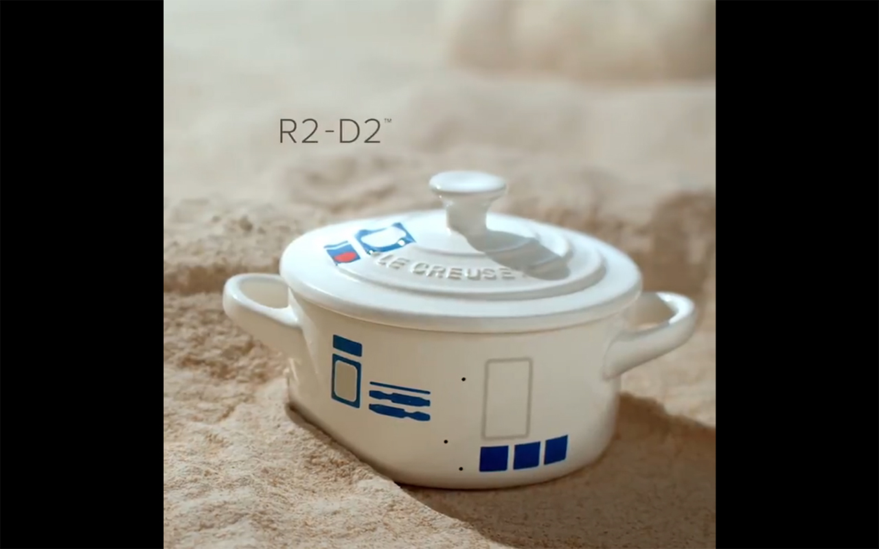 There's a cast iron casserole pot collection (called mini cocottes, here,) made with designs that look like droids. One looks like R2-D2, another looks like C-3PO, and a third looks like BB-8. The designs on these pots are extraordinary in their simplicity – almost like the company didn't want the fact that they cross-branded their products to lower the level of quality in industrial design at which they hold themselves with every other product.