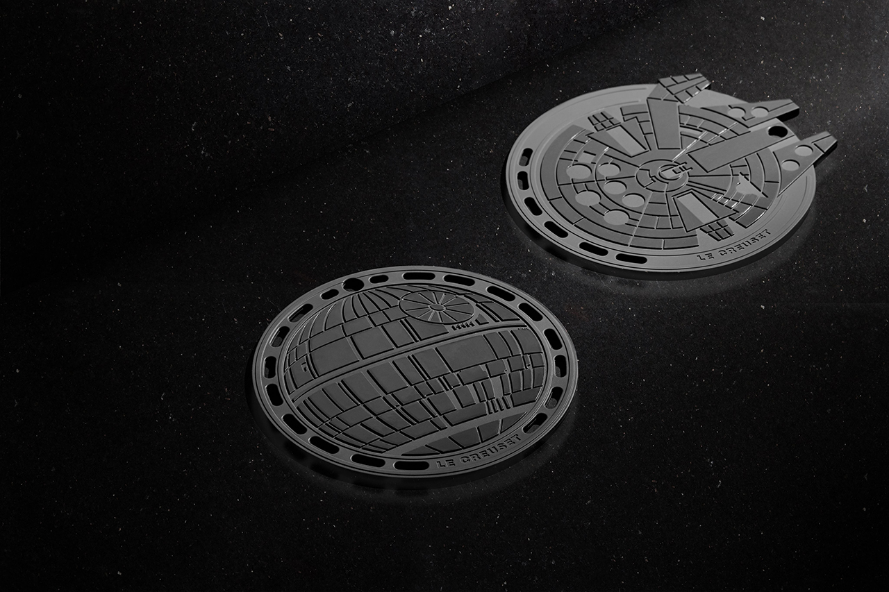 Above and below you'll find the full Le Creuset Star Wars collection revealed for the first time on October 4, 2019. There's a pair of trivets made of silicone in this collection. One has a Millennium Falcon design, the other has a Death Star.