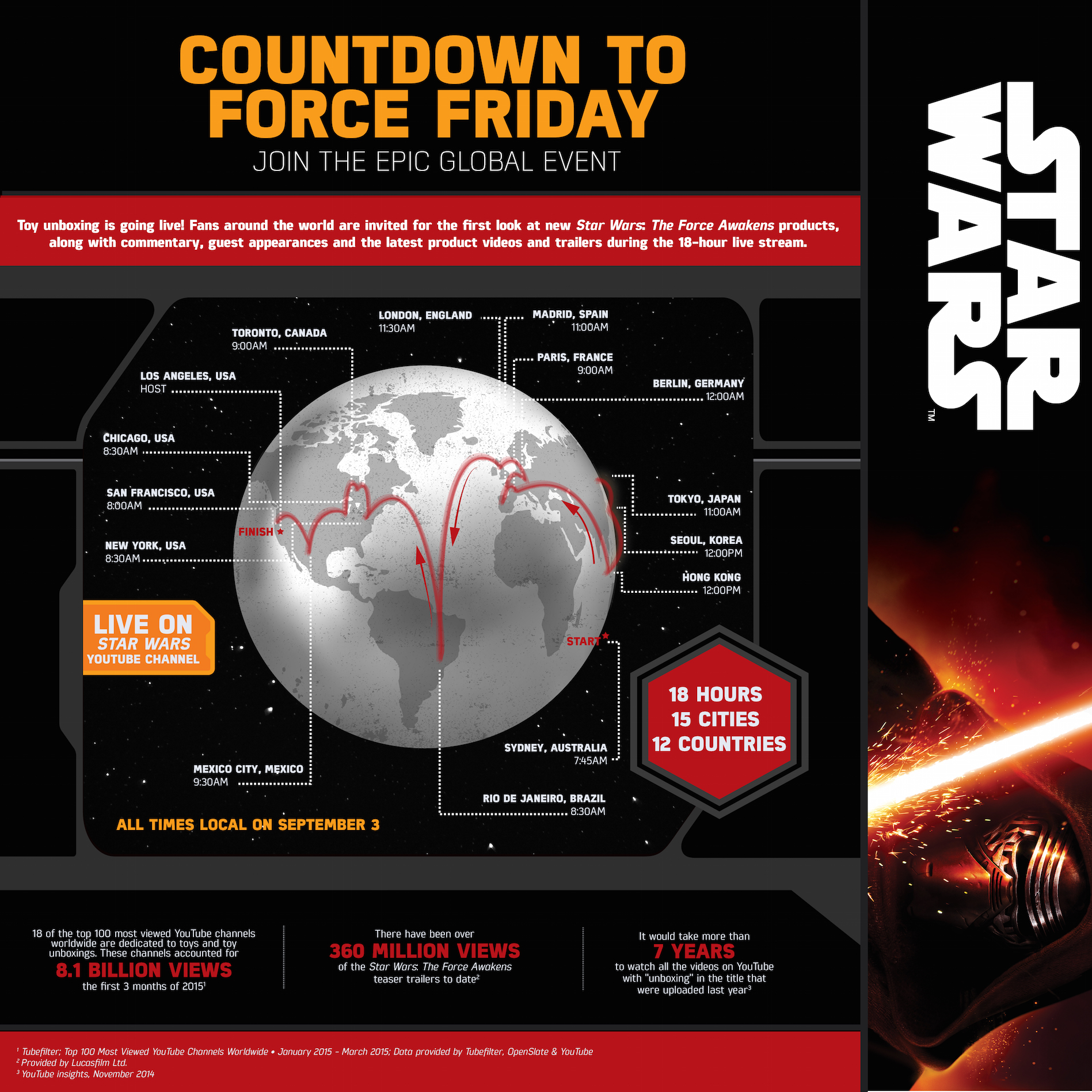 The Star Wars YouTube channel will be hosting the live stream. Each city will see a YouTuber popular for their "unboxing" videos give the first look at a Star Wars: The Force Awakens-inspired product, followed by the event moving on to another city.
