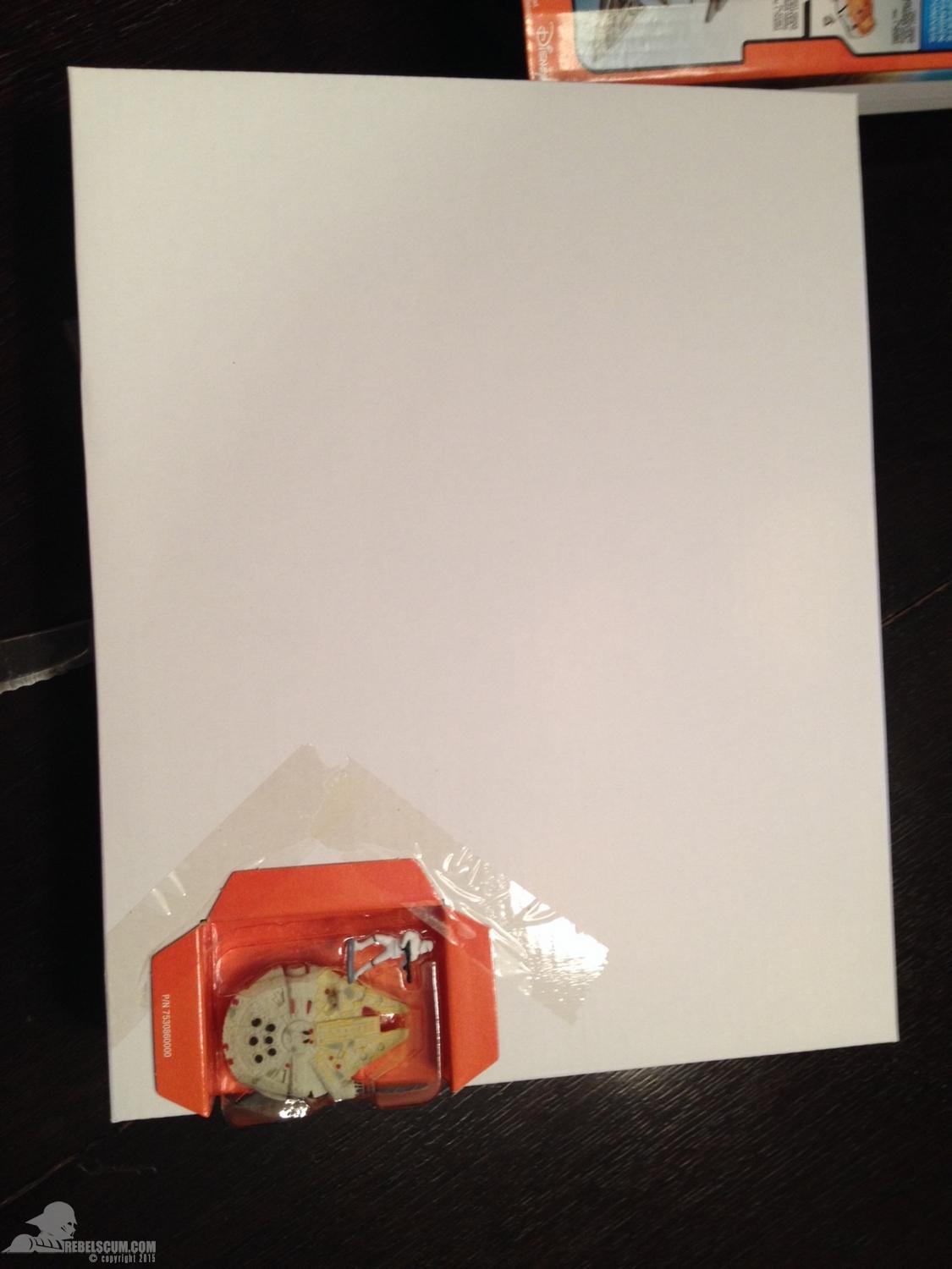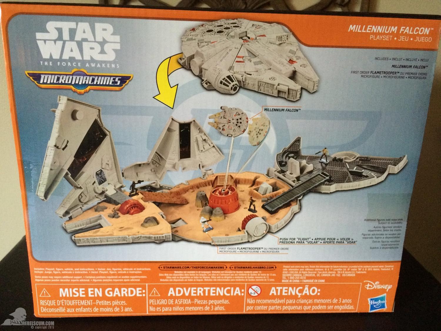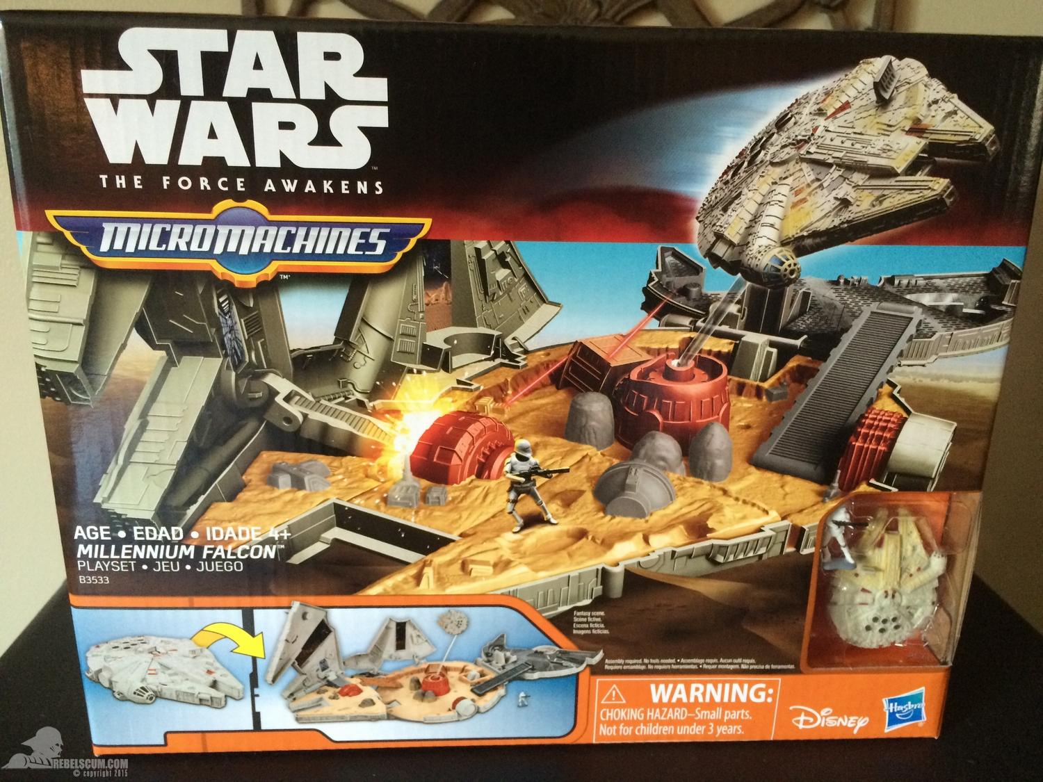 We see the Millennium Falcon Micromachines box set, which has Hasbro and Disney labeling and a picture of a Millennium Falcon toy that opens on a hinge. The side of the box, though not the clearest shot, shows other Micromachines sets that aren't pictured but apparently are inbound.