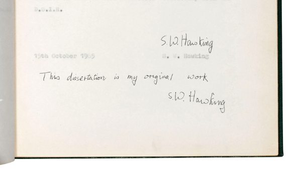 Within the lots hawked by Christie's for the estate of Steven Hawking (run by his tots), lots of cool stuff can be bought. What we're looking at today is a set of 22 lots sold by Christie's on behalf of the Stephen Hawking estate. This set of lots includes such gems as an original dissertation by Hawking, signed "this dissertation is my original work." Also in the mix: A Time Traveller party invitation poster.