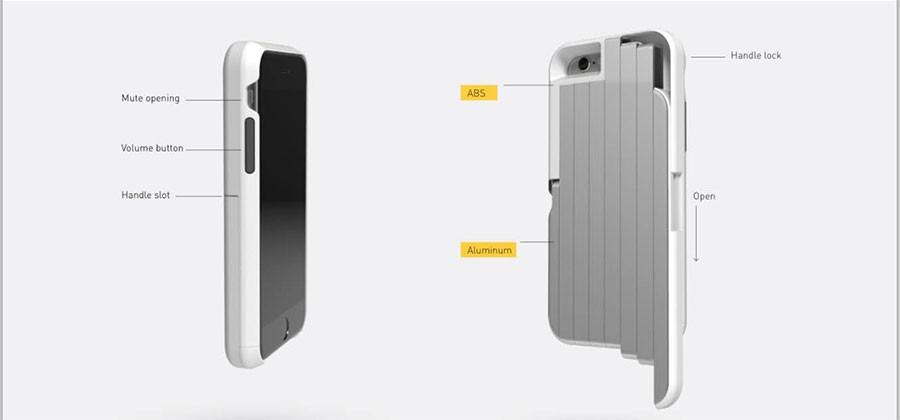 Those metal bars actually fold out and allow the back of the smartphone case to be turned into a selfie stick allowing you to take all the annoying selfies that you want. The design of the case allows the 28-inch long selfie stick to collapse down and the user can carry both a protective case and the selfie stick in one device.