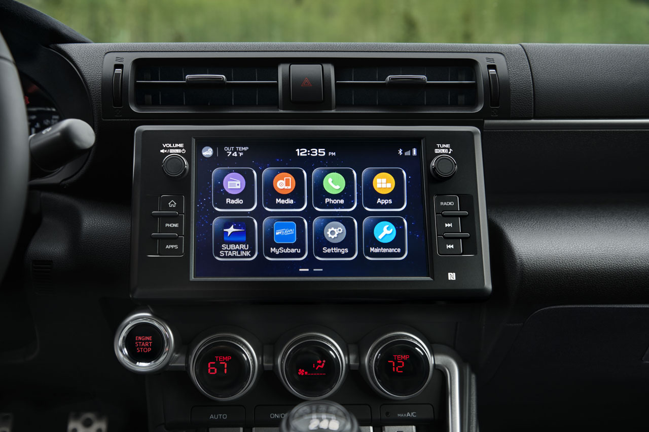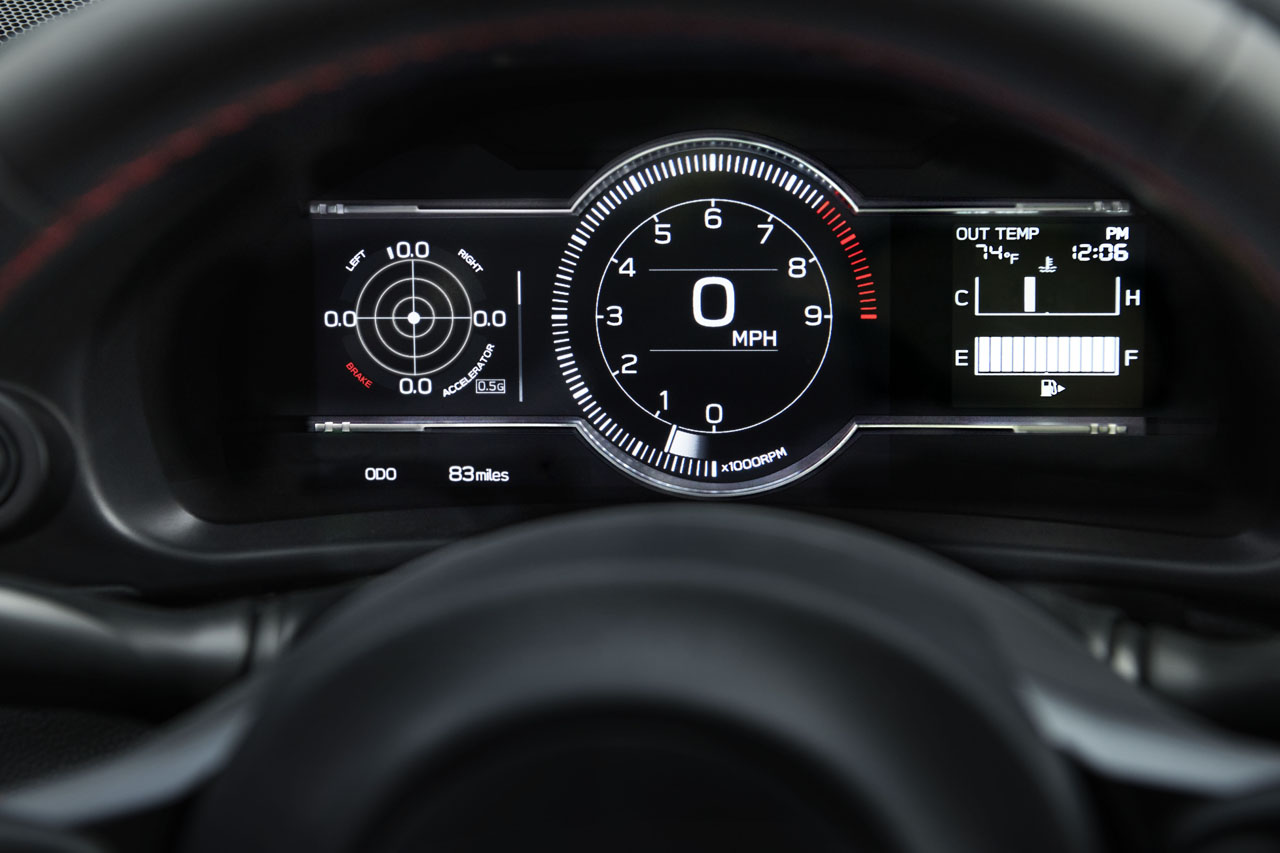 Subaru also added Active Sound Control to enhance the engine sound within the cabin, and driver's knee airbags has been added. The interior has been redesigned to make everything easy to control and access for the driver. The car has a seven-inch customizable digital instrument panel that puts the tachometer front and center along with a digital speedometer. A programmable meter to the left of the tachometer can display amps, coolant temperatures, or lateral-G forces.