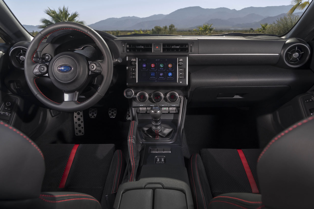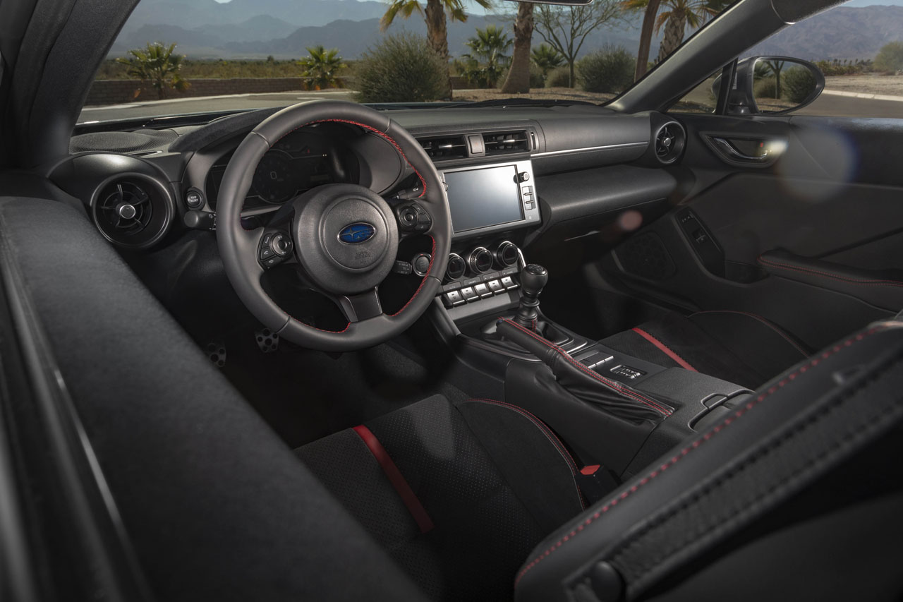 For 2022, Subaru offers the BRZ with either a 6-speed manual transmission or a six-speed automatic. Both vehicles have the same list of standard features, including a Torsen limited-slip differential, keyless access with pushbutton start, LED headlights, vehicle stability control with track mode, 17-inch wheels, dual-zone automatic climate control, incline start assist, heated exterior power mirrors, power fuel-door lock, power windows, rear center console storage with USB ports, and intermittent windshield wipers with a speed-sensing this feature. For 2022 the TPM system also supports two sets of wheels to be registered, allowing a change to seasonal tires.