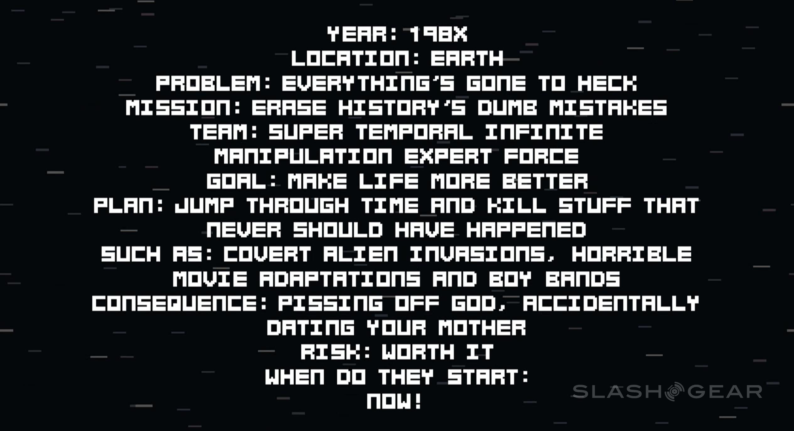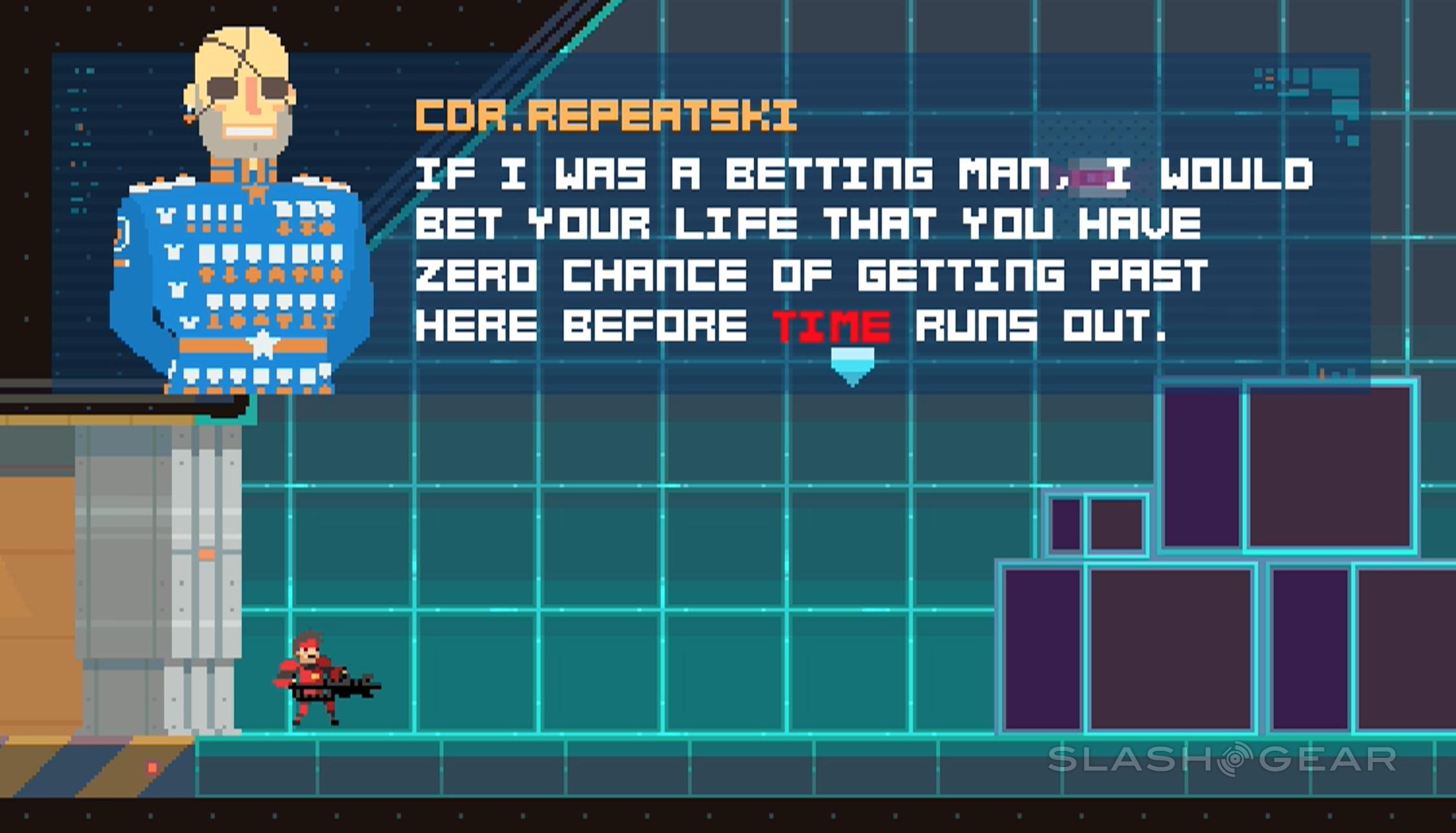 Above is the first 15-minutes of the game as we experienced it. This game begins with an unexpectedly large amount of storyline – for what we expected the game to be – quickly letting us in on the secret: just because Super Time Force is an "indy" game, it doesn't have to skimp on the details.