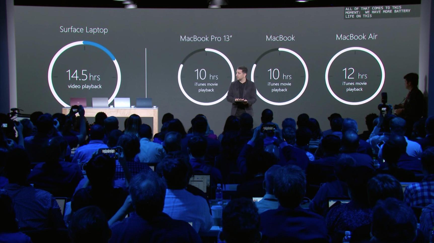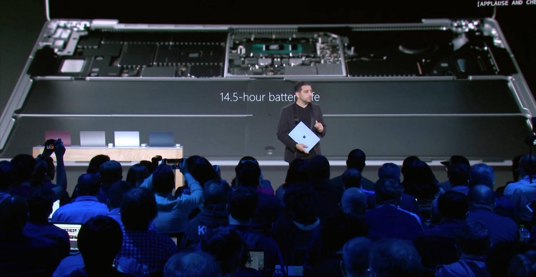 Around the edges are a Surface Connect port, USB 3 (USB-C), and miniDisplayPort. As well as a standard headphone jack, thank god. Inside is a battery that Microsoft suggests will give users 14.5-hours of uptime. While Microsoft will be running the peripherals game like Apple with their MacBook and MacBook Pro, they'll be pushing battery life so good there's no need to bring the charger with – not that that's something we'll be doing or anything.