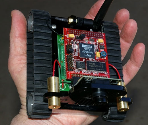 If WowWee's Rovio whet your appetite for a remote-controlled WiFi webcam robot, but it's just too big to surreptitiously scurry around your office, then how about the Surveyor SRV-1 Mobile Robot. Small enough to fit into a (relatively meaty) palm, the SRV-1 connects via WiFi b/g and can beam back video from its 1.3-megapixel camera.Video demo of the SRV-1 after the cut