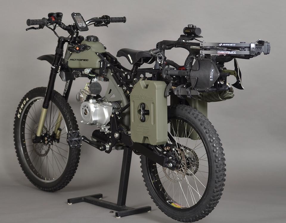 We've seen big trucks decked out for the ever-anticipated apocalypse, but if you're looking for something a bit smaller and easier on gas, Motopeds has a bike that fits the bill. The Survival Bike: Black Ops edition, is a model outfitted with an end of the world arsenal, including a crossbow and tomahawk.