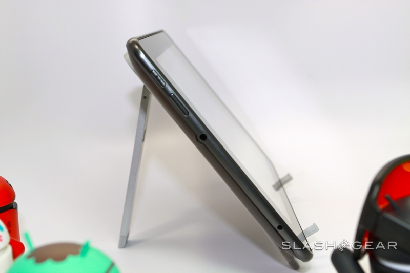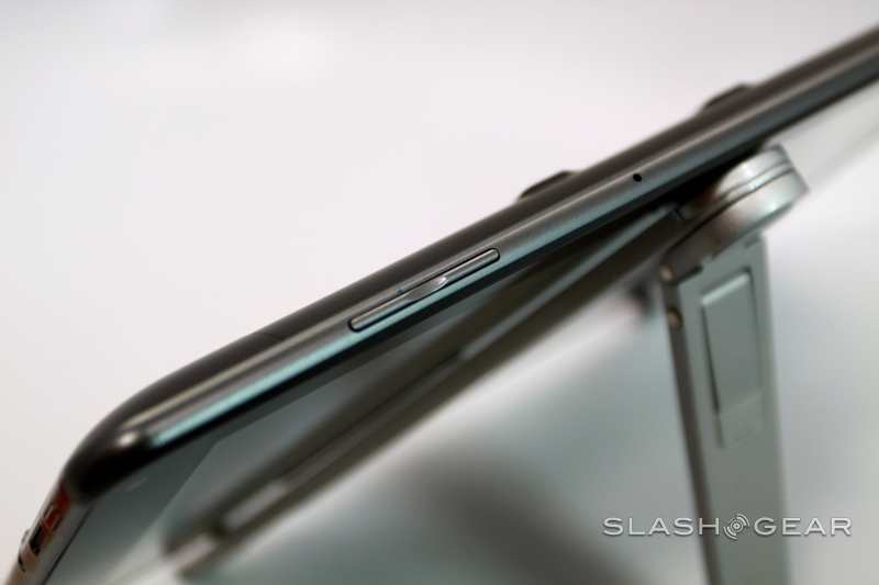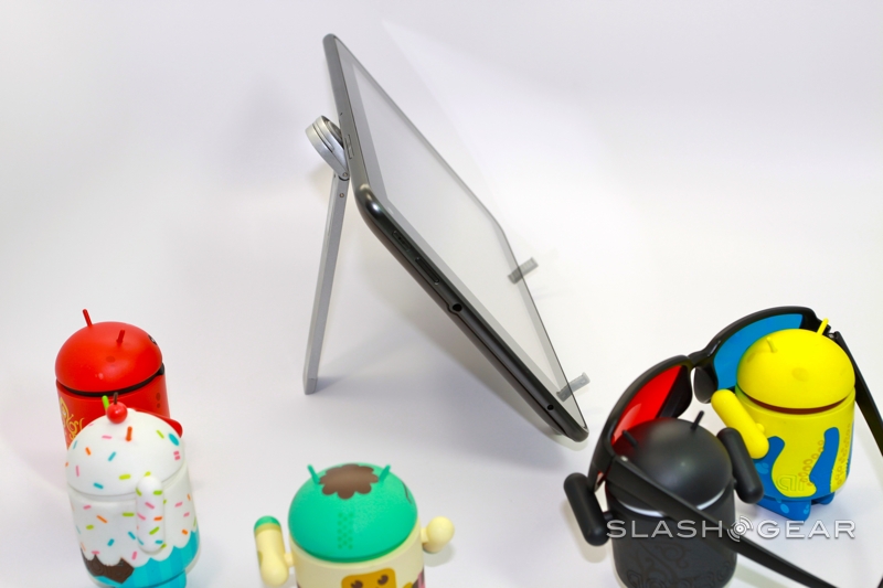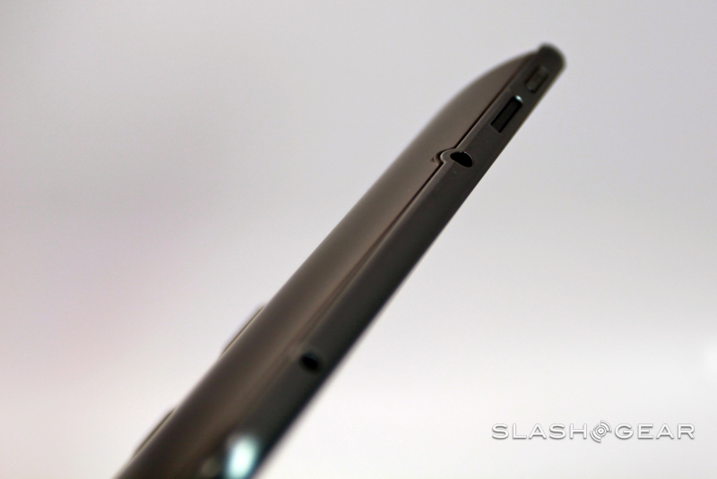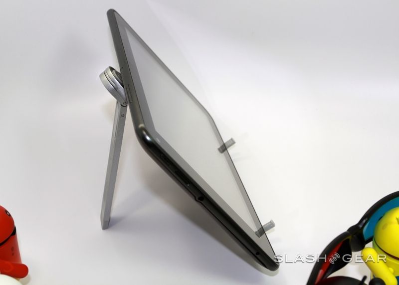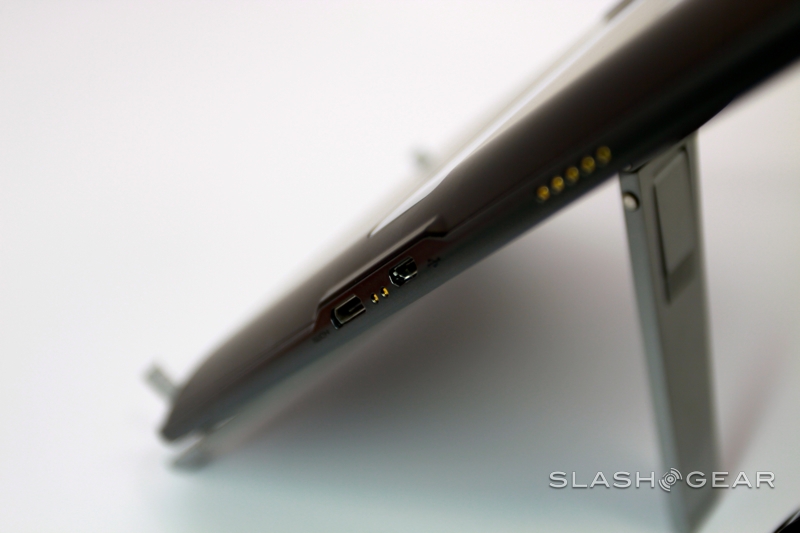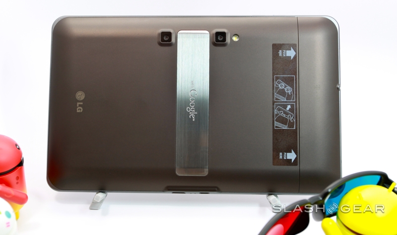 On the front is a 2-megapixel camera for video calls, while a dual 5-megapixel camera array on the back – with a single LED flash – supports 3D photography and video capture. In-between the two lenses there's a flip-out metal kickstand, useful for propping the tablet up for video playback (though generally not at the right angle for standalone 3D recording). We often found ourselves smudging the rear lenses when holding the G-Slate in portrait orientation. Ports include microUSB and HDMI on the bottom edge, as well as contact points for the optional docking station, and a 3.5mm headphone jack on the left edge. Volume controls and a power/standby button are the only physical keys to be found.