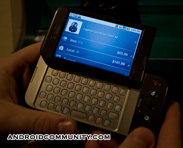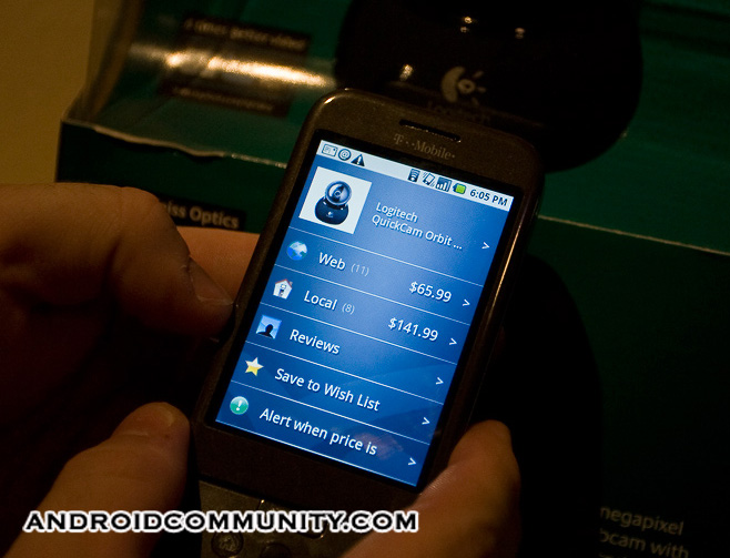 Android Community got to spend some more hands-on time with the T-Mobile G1 this evening, at a special developers event held in Dallas. Big In Japan – the company behind Google Application Challenge award winning app ShopSavvy – were there, demonstrating the software in action on a G1. Fully operational, we were able to scan a barcode (in this case, a Logitech webcam) and compare prices both at local stores and online.