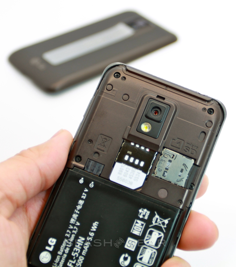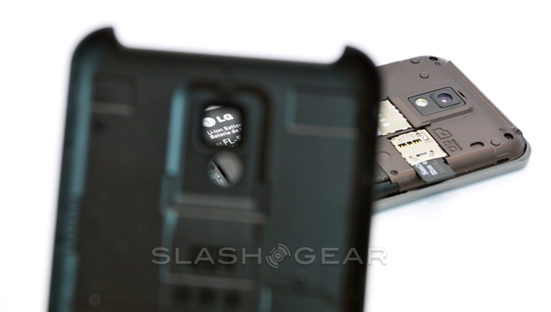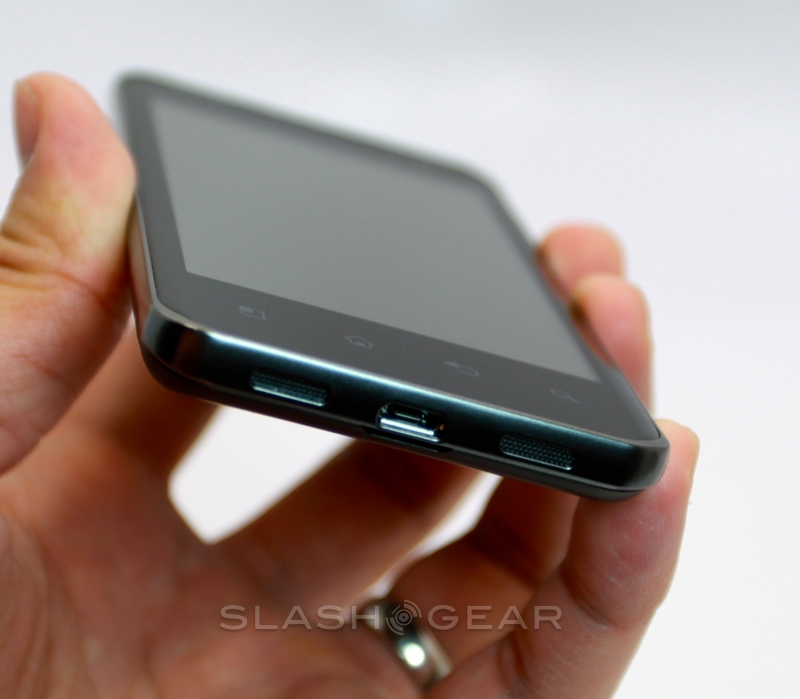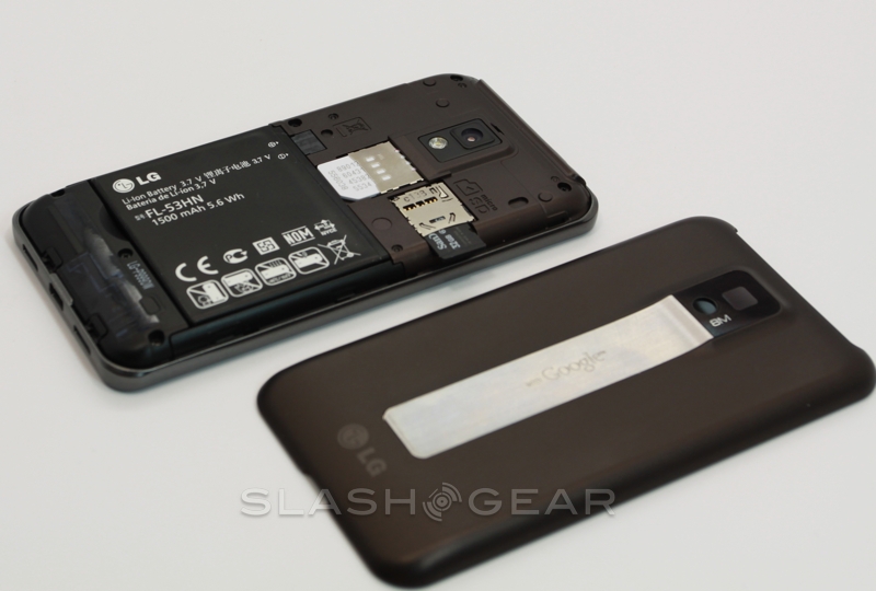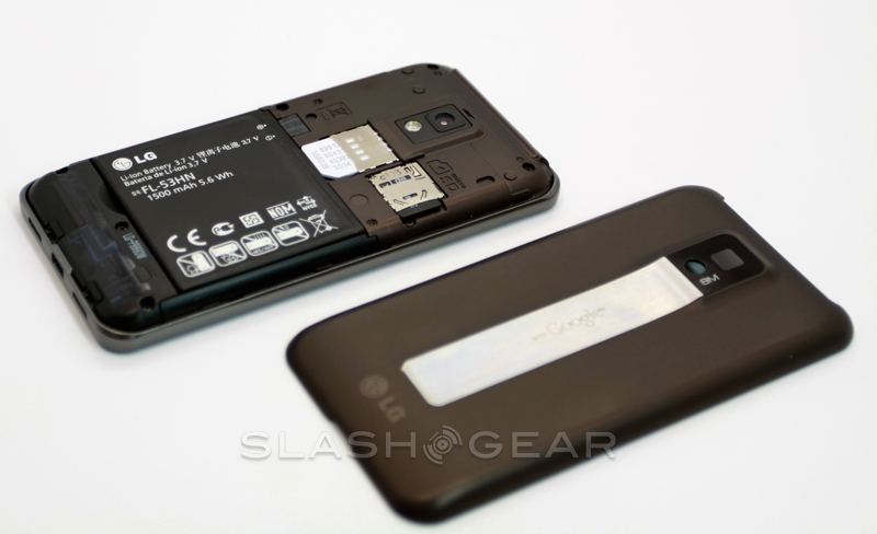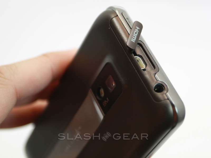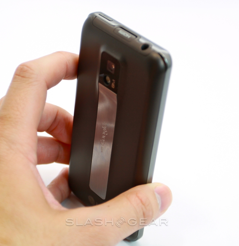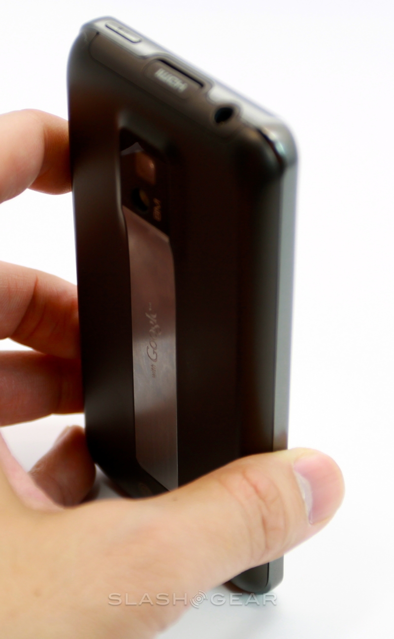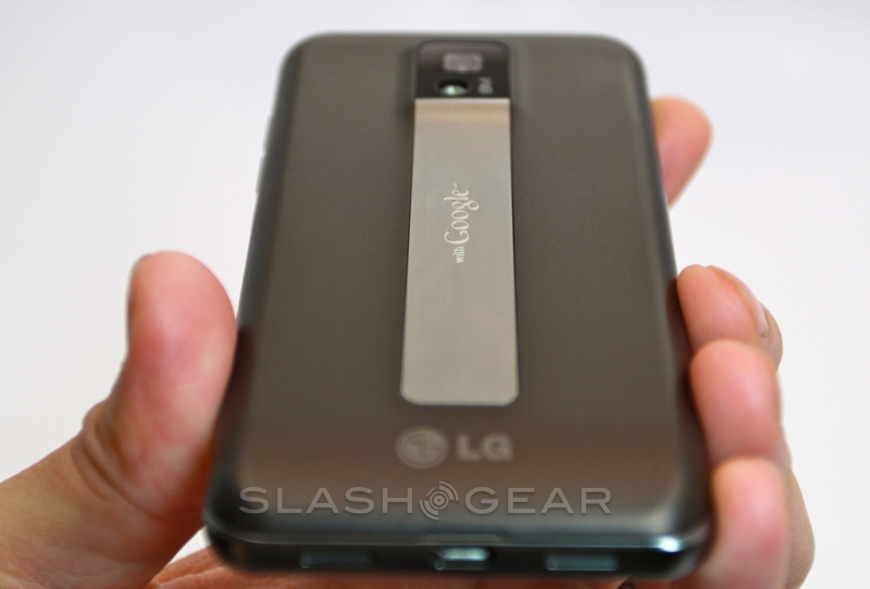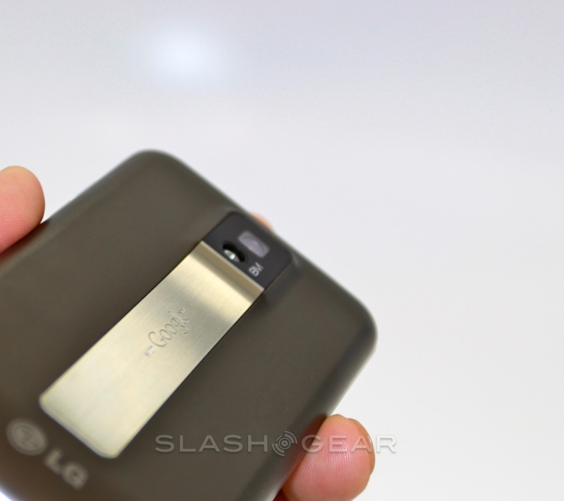While at first glance the battery cover looks like, as with the T-Mobile G-Slate by LG, there's a flip-out kickstand, in actual fact the silver strip is merely decorative. It leads up to a protruding camera bump and bears the "with Google" legend that lets you know LG and T-Mobile have held off from tampering with the OS. Around the edges there are volume keys, a microUSB port and twin speaker grilles on the bottom, and a headphone jack and power/standby button on the top. You also get a micro HDMI port for hooking the G2x up to a TV and playing back the 1080p Full HD video Tegra 2 is capable of churning through.
