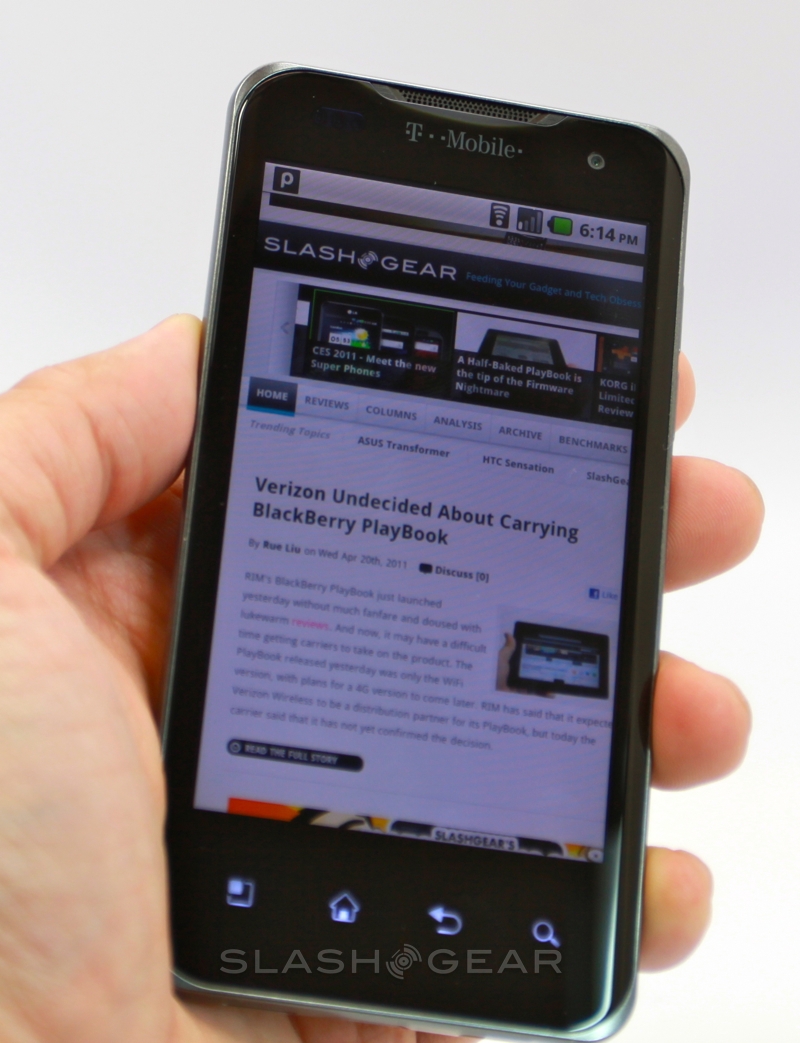 Build construction is solid, though the G2x feels overly long in the hand. Audio quality is high from the dual speakers, while the touchscreen responds swiftly and the capacitive buttons don't require the occasional double-taps we've experienced on some Android devices. We can't help but miss the ATRIX 4G's qHD resolution display, however, with its extra pixels.