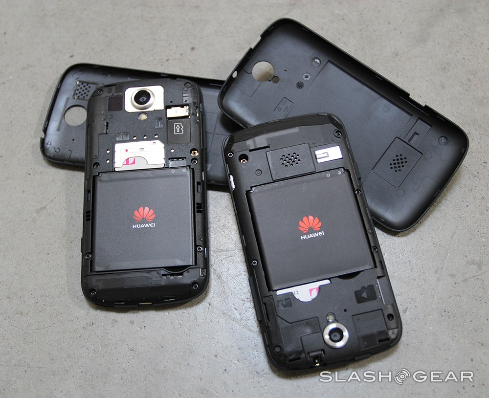 You can see when you remove the back of these devices that you've got a Huawei battery (at 1500mAh) and room for a microSD card for an additional 32GB of storage space. You're also using a full-sized SIM card and a the battery cover has a strange feel to it – almost like a very very fine sandpaper. You've got a dedicated physical camera button on the lower end of the right side of each of the phones, and your lockscreen can access the camera directly along with messages and your phone dialer.