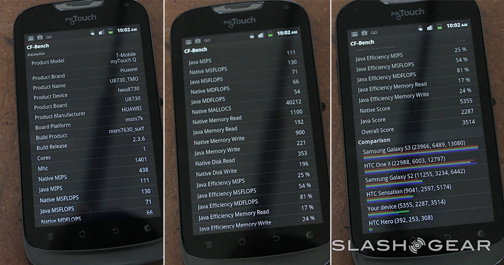 Have a peek at some benchmark results here – and note that results have been essentially identical on both devices, so much so that we're posting one set of results here that fairly represent both near-identical devices. You'll see right away that these devices are not made for those looking for a massive amount of power. Instead they're meant for users looking to play basic games, social networking, and general phone communication activities.