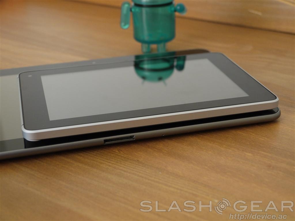 Now for that iPhone 4 comment I made above. The entire device is housed in a lightweight and extremely durable brushed aluminum and the top has a nice squared design but it looks a bit too similar to the iPhone if you ask me, but that isn't necessarily a bad thing. The top, or left side when holding in landscape mode features the 3.5mm headphone jack and two stereo speaker grills.