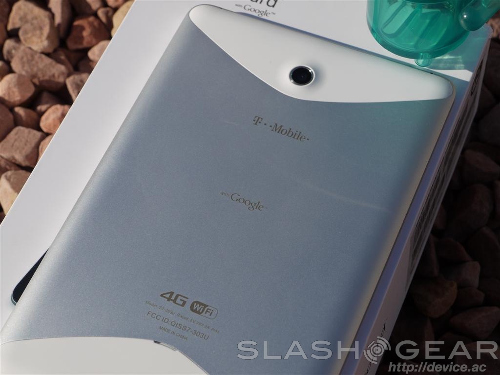 Now lets break down the hardware. The Springboard is one of the first 7" tablets to offer the full 1280 x 800 HD resolution of larger devices. All recent smaller tablets have been offered with a 1024 x 600 resolution. What that gives us is a small and portable tablet with an exceptional viewing experience. So, we have that 7" HD display — powered by a 1.2 GHz dual-core Qualcomm processor, 768MB of RAM, 16GB of internal storage and a pair of cameras. 5 megapixels around back and 1.3 on the front — all pushed by T-Mobile's 4G HSPA+ network.