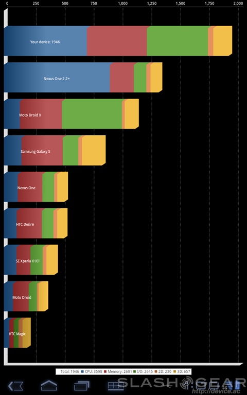 Benchmarks weren't extremely impressive and with Quadrant we score a decent 1950. The 7" Acer Iconia A100 with the slower clocked Tegra 2 scores well over 2000 compared to the faster 1.2 GHz chip in this Springboard, but the lower 768MB of RAM could also play a role here too.