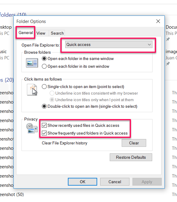 In Windows 10, File Explorer (also known as Windows Explorer in previous incarnations) got more than just a facelift. A new section on the Navigation panel to the left appears, as well as in the main area of the window when you first launch the program. This is Quick Access, which lets you immediately jump into favorite folder and most recently used files. To some effect, it replaces the Favorites list in previous File Explorers, though this one is more dynamic as it can populate that list with new items. Of course, you can turn this behavior on or off as desired. Simply go to the View tab of Explorer and hit Options. At the bottom of the General tab are the options to show or hide certain bits of information. You can also pin folders in the Quick Access list on the navigation panel to make sure they don't disappear regardless of frequency or recency of use.