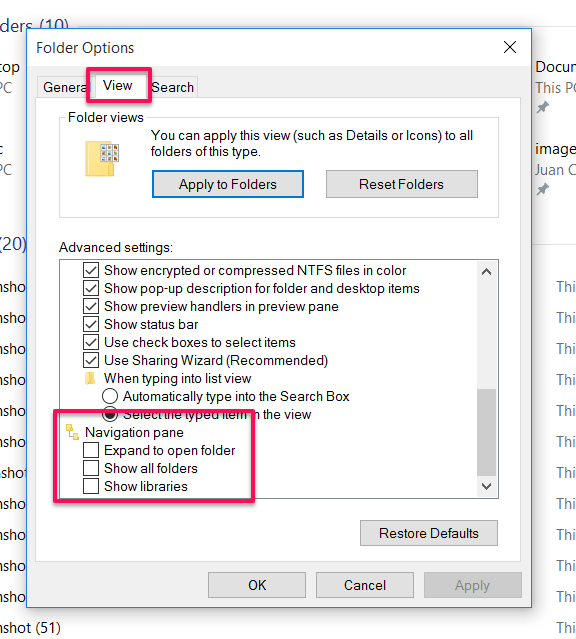 On the other hand, if you prefer the classic File Explorer look, you just need to take two steps to make that happen. At the top of that same General options, you can set File Explorer to open This PC instead of Quick Access. Second part is going to the View tab beside General, scroll down the Advanced Settings list, and check Show libraries.