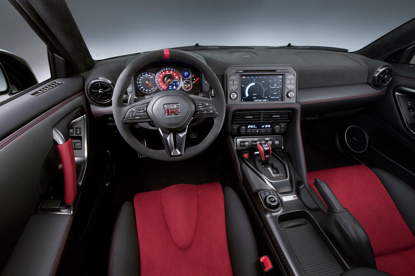 Inside the new car, there's the same 8-inch touchscreen, redesigned dashboard, and new steering wheel – the latter two wrapped with Alcantara – of the regular 2017 GT-R, though NISMO provides a pair of leather-trimmed Recaro seats with red synthetic suede inserts.