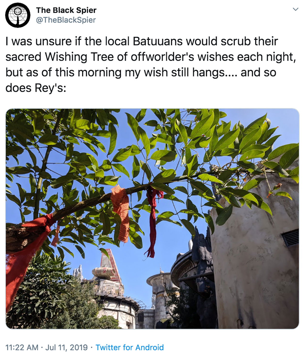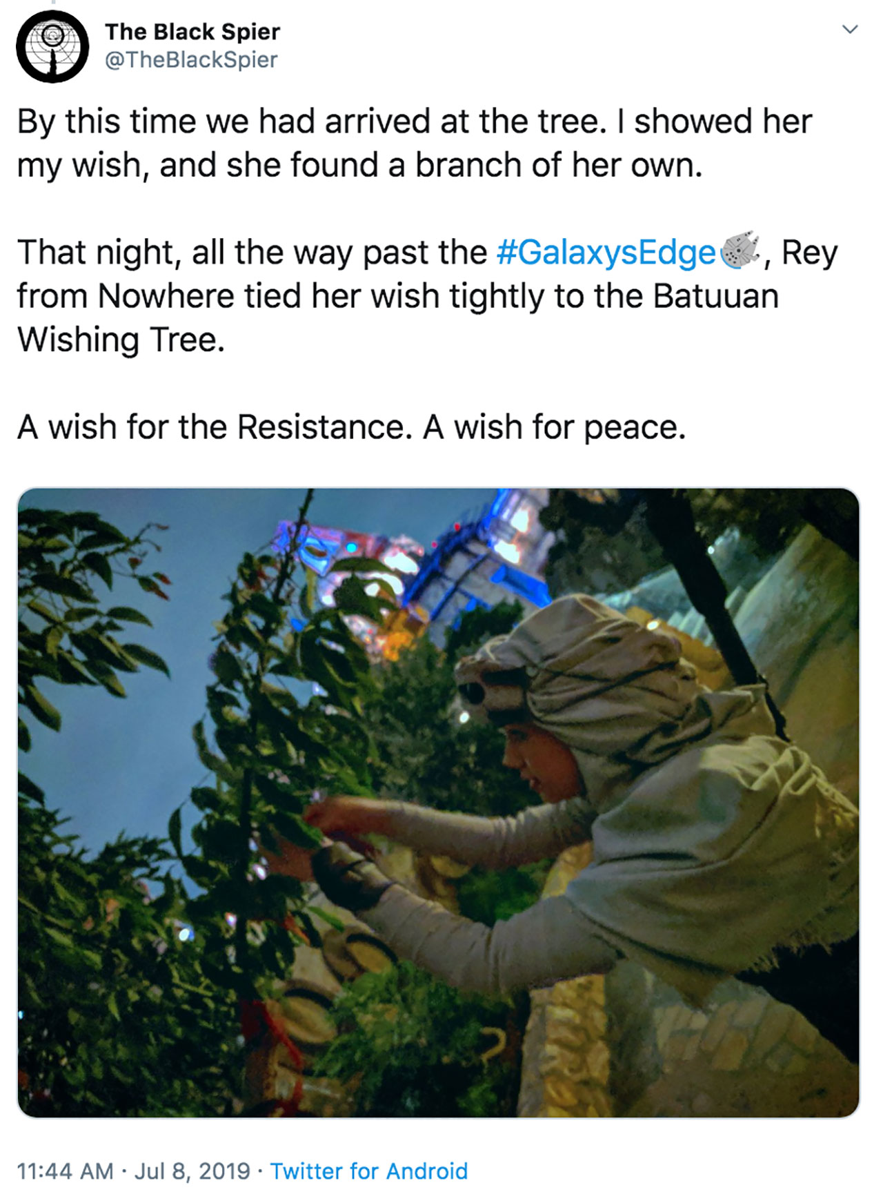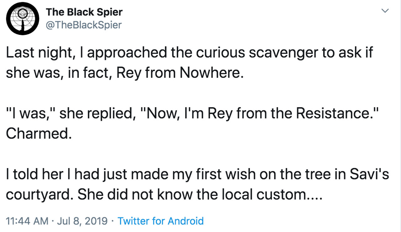 The gallery above shows the story of another, similar traveler who rolls through the park and makes it their business to share their experience with the world. The Black Spier, here, shares a story that might just be too on-point to ignore. Keep in mind this was apparently an off-the-cuff conversation had with the actor playing Rey at Galaxy's Edge (Star Wars Disney park) in July of 2019.