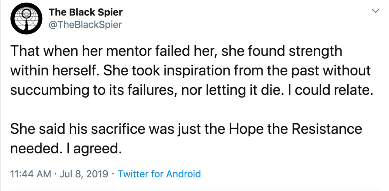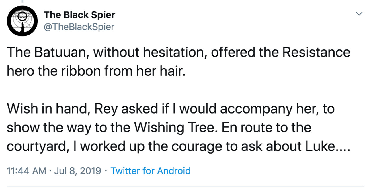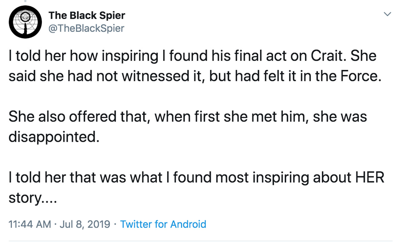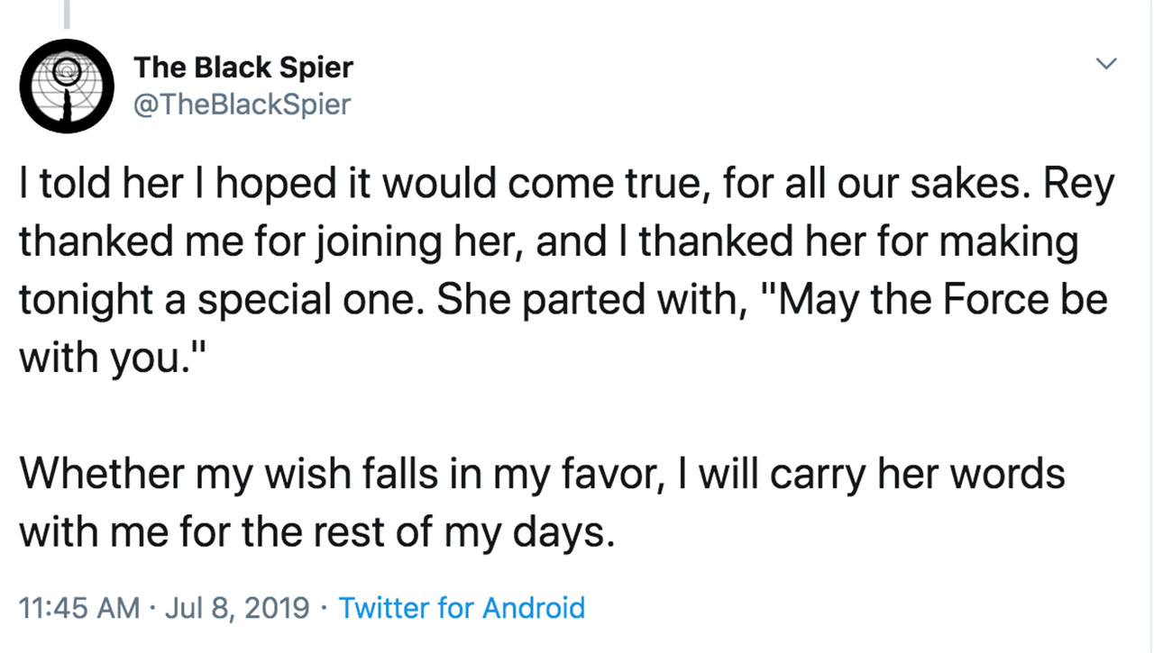 The gallery above shows the story of another, similar traveler who rolls through the park and makes it their business to share their experience with the world. The Black Spier, here, shares a story that might just be too on-point to ignore. Keep in mind this was apparently an off-the-cuff conversation had with the actor playing Rey at Galaxy's Edge (Star Wars Disney park) in July of 2019.