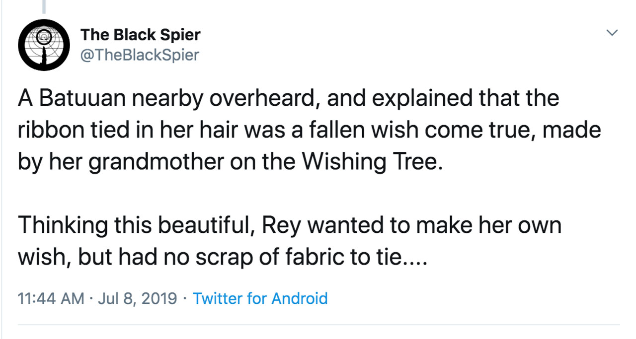 The meaning of the red material on Rey's hand might not be analogous to that of the ribbons on the wishing tree on Batuu. But the expanding universe Disney and Lucasfilm have borne is very much a reality. The idea that a bright red ribbon could mean nothing is far less likely now that the possibility that said ribbon is a real link to the universe outside the film series.