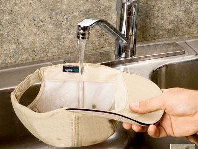 The Hydroweave system combines hydrophilic (water-attracting) and hydrophobic (water-rejecting) fibers in a three-layer fabric that conducts body heat upwards, while retaining the cool water and releasing it slowly through evaporation; even while the middle layer holds onto water, your head remains cool and dry thanks to an inner lining that water cant permeate. The end resu lt is a hat that actually cools you more effectively the hotter the air temperature.