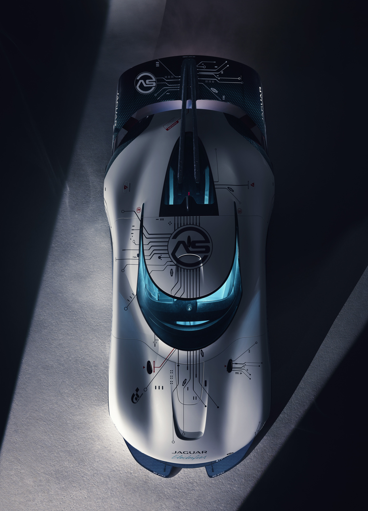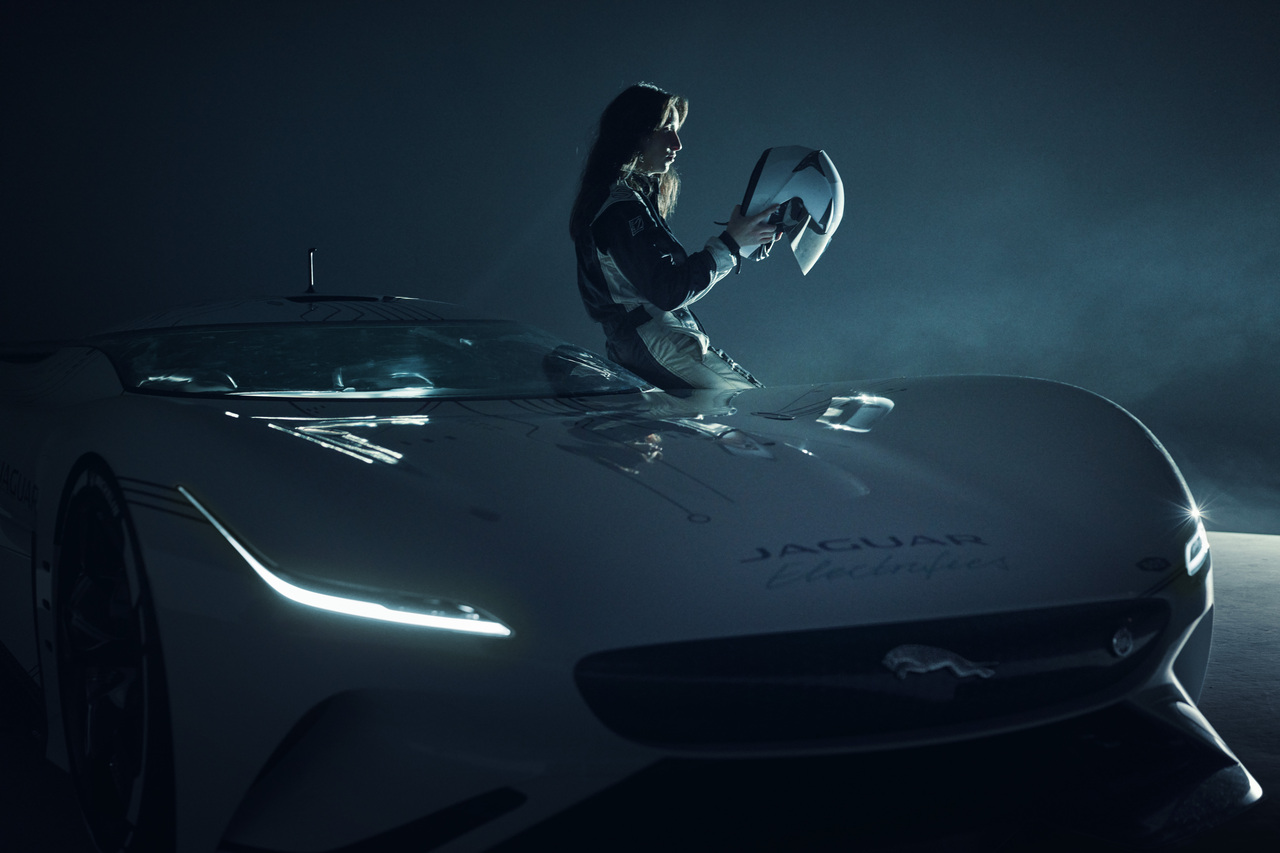 The smooth, aerodynamic composite body structure pays homage to the Jaguar C-Type and D-Type with its bulbous fenders and extended tail fin. Vision GT measures 5,540 mm long and is 861 mm longer than its predecessor. According to Jag, the growth spurt is necessary to offer better downforce and provide more room for installing a new front splitter and deployable rear wing.