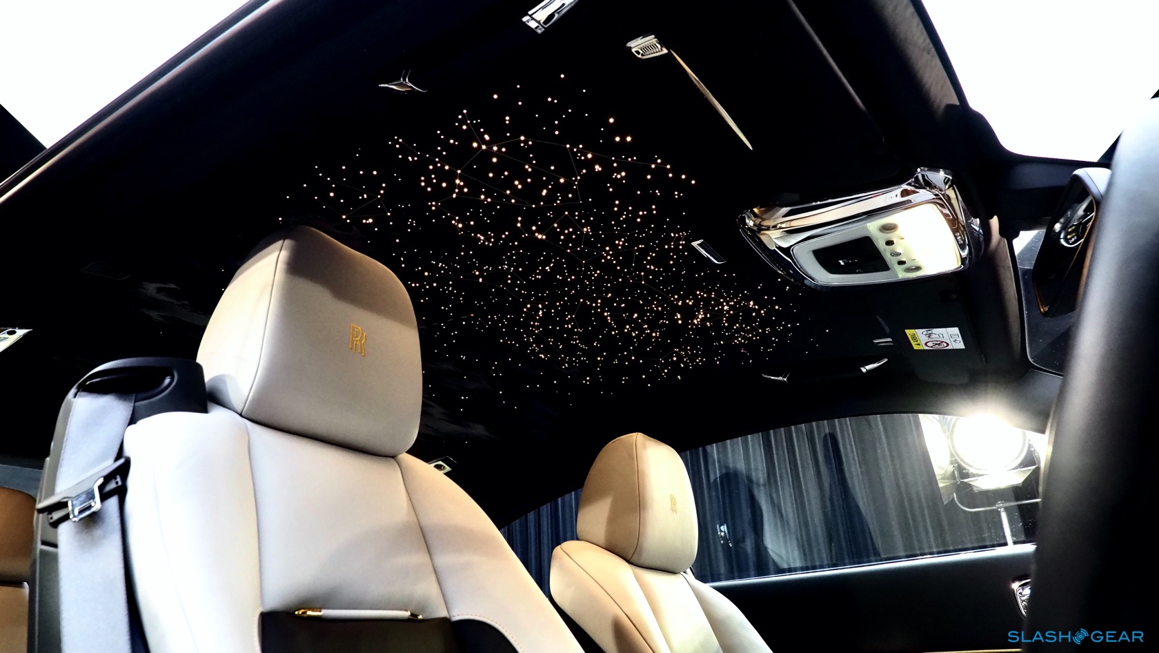 But the single most striking element in the interior is the starlight headliner. Unlike the starlight headliner in your Phantom, the Wraith Eagle VIII has embroidered clouds that took a week to create by hand. There are 1,183 starlight fibers in the headliner, which are arranged to depict the celestial arrangement during the 1919 flight. The flight path and constellations are embroidered using brass thread, but the red fiber optic light points to the exact moment when the duo lifted above the clouds to navigate by sextant.