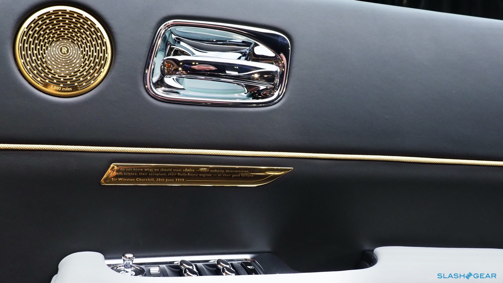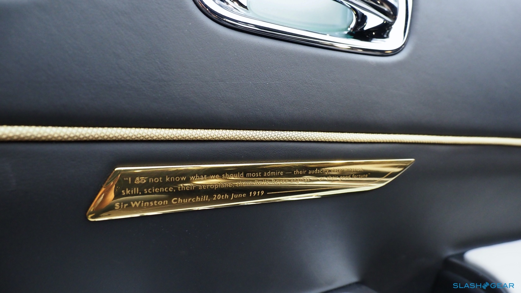 Opening the suicide doors reveals an elegant and tasteful interior with brass accents, including "RR" monograms on the headrests which are embroidered using brass-colored thread. The seats are engulfed in the softest and finest Selby gray and black cowhide. You'll also find the brass speaker covers that depict the 1,880 miles of non-stop flight. There are also brass elements on the navigator door panniers. The driver's door includes a brass plaque with the famous quotes of Sir Winston Churchill after the duo achieved the impossible.