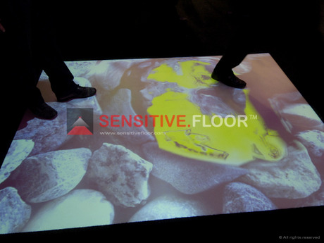 Sensitive Floor is an interactive video floor projection, which reacts to the way you walk on it. This is a new an interesting way for you to use what would normally be a dull and boring floor. There are many applications for the Sensitive Floor such as using it at exhibition, in retail stores, ad placements, or simply a welcome mate for your front door. As a business owner, I think it's a great tool to communicate with your customers.
