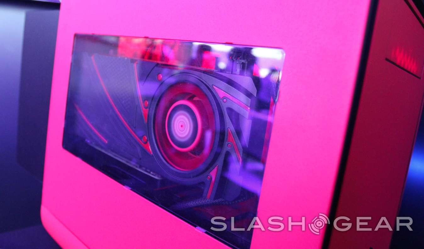 This demonstration makes use of a high-end Webhallen case – the same we saw earlier this week working as a Steam Machine. Inside you've got an AMD A10-7850K with AMD Radeon R9 290X graphics – spinning through the window up top here for your enjoyment. Also present is 8GB of DDR3 memory and a 120GB SSD for good measure.