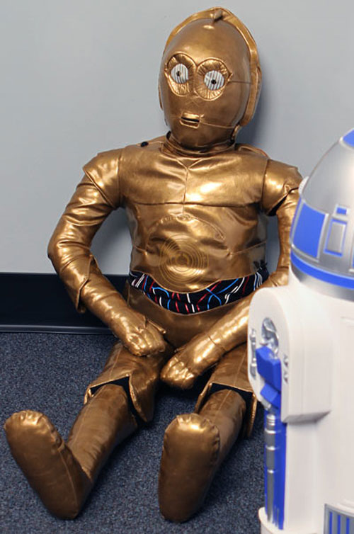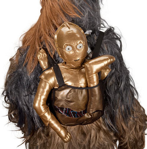 ThinkGeek's backpack is so cool it hurts a little. The droid and his severed limbs are covered in gold leatherette and he is stuffed with plush fiber fill. The mesh pouch keeps all of the parts safe and the eyes of the robot light up and flicker.