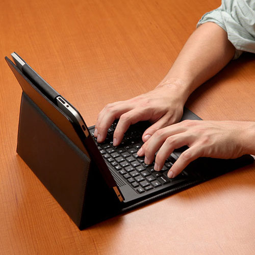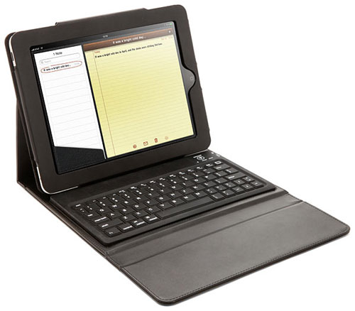 The case sells for $59.99 and is available right now. The batteries inside the keyboard recharge using USB and it is packed inside a black leather iPad case with a magnetic flap. That flap can prop the iPad in different positions for comfortable viewing. The case and iPad together weigh 2.75 pounds and the keyboard has iPad specific keys. Those keys include home, volume, iPod controls, and search. The battery is good for 90 hours of continuous use.