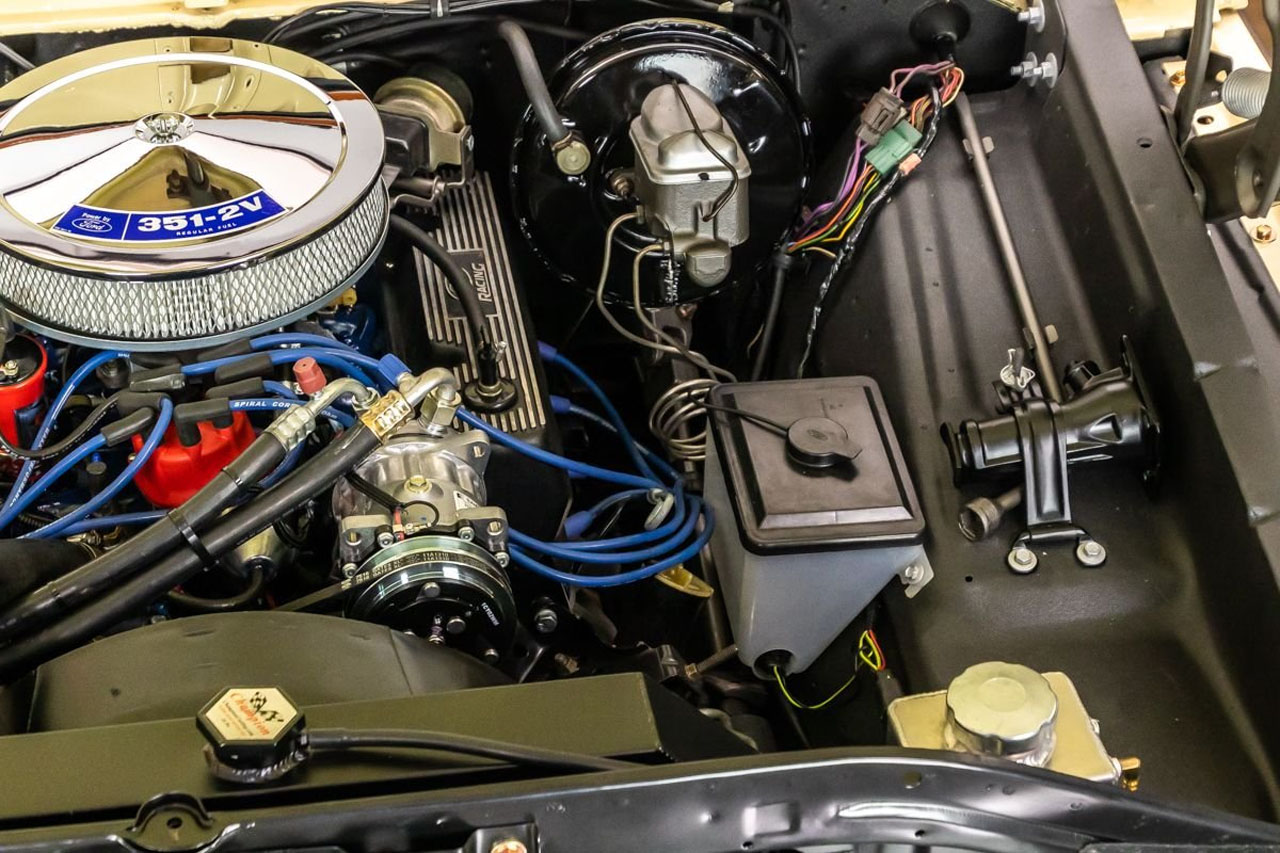 The 351 cubic inch engine features an aluminum Weiand intake manifold and a Holly four-barrel carburetor meant to give it more power and performance. The brown and beige interior features a front split-bench seat with shoulder belts, full-down rear bench seating with lap belts, brown carpeting, and plenty of woodgrain accents common in vehicles from the late 70s and 80s.